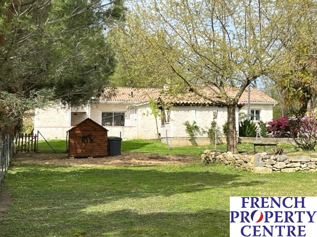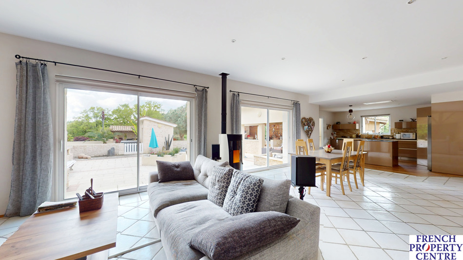 Contemporary one-storey house with large open living area and expansive windows, perfect for the natural light to illuminate the interior while enjoying the pool and garden views. Approximately 210m2 habitable area leading to the terrasse, pool and jacuzzi. An impressive living room of approx.85m2 with open fitted kitchen; a utility room, a study, three bedrooms, a bathroom and a spacious parentale suite of 30m2 with bathroom and dressing room. Double garage and a carport plus a further single garage and atelier. Underfloor heating & pellet burner. Enclosed garden of over two acres. Calm area just minutes from a bastide town, 15 minutes from Eymet and 25 min to Bergerac.