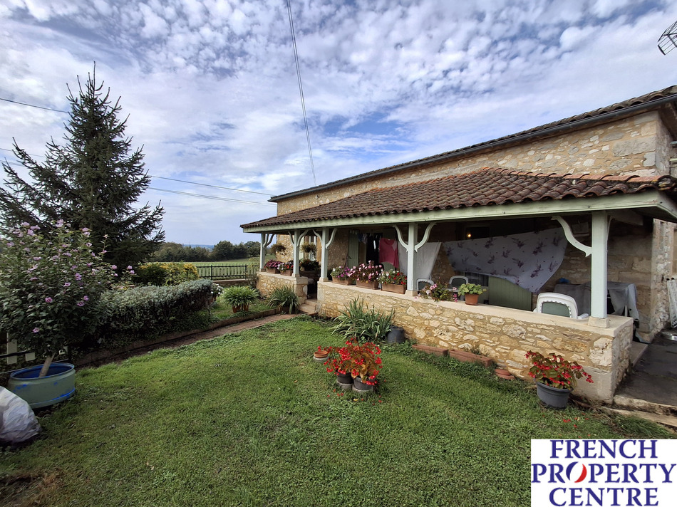 in a rural setting, 60m2 stone house renovated about 12 years ago offering an open plan fitted kitchen / living-room, 1 bedroom, 1 office, shower-room and toilet. Oil fired central heating, double glazing. Covered terrace with views towards Monflanquin. Adjoining double garage with boiler-room. Cellar in the basement. On approximately 550m2 of land. Sold with a tenancy lease, ideal for investors.