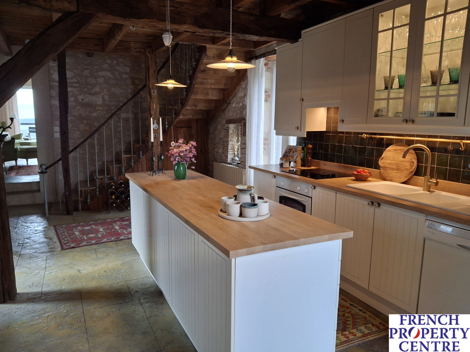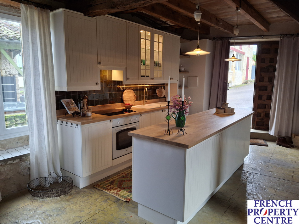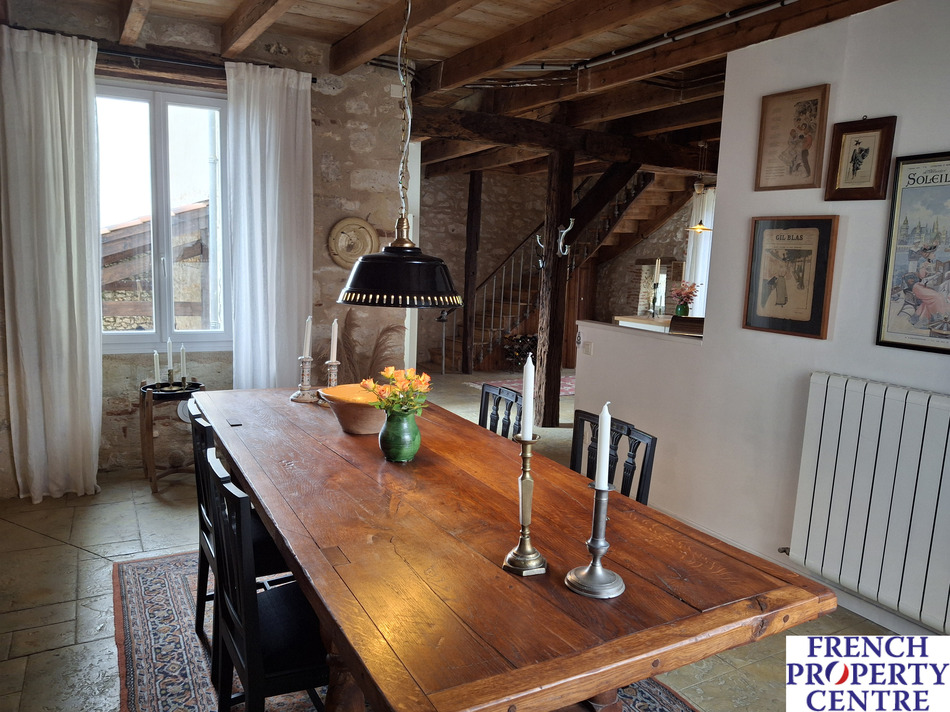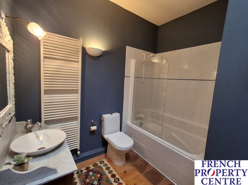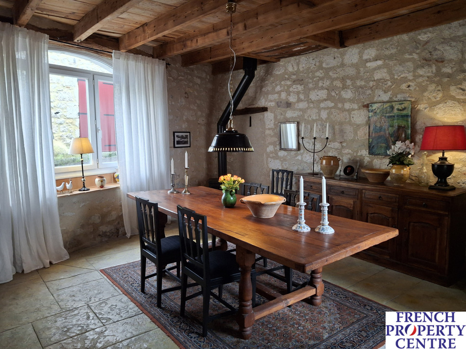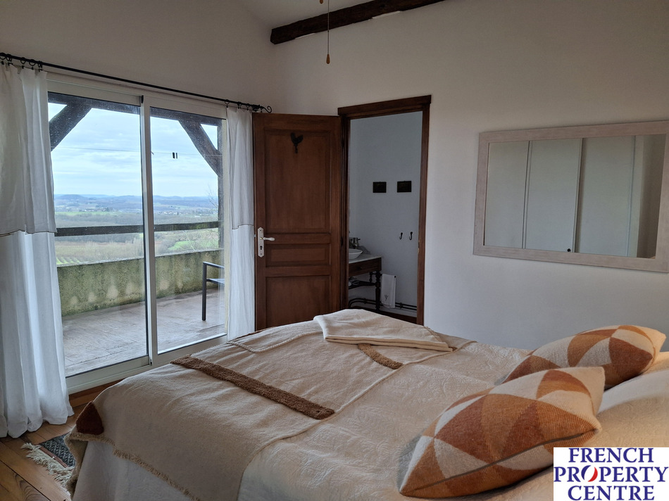 in a lovely rural village set on top of a hill, 10mns drive from Monflanquin, this lovely stone house offers on the ground floor an open plan fitted kitchen / dining-room, separate toilet, a living-room with doors opening onto a balcony that offers panoramic views over the valley; on first floor, a corridor leads to a bathroom and 3 bedrooms including an ensuite with a covered terrace enjoying breathtaking views. in the basement, a large heated room with an old bread oven gives access to a cellar and a very private courtyard with hot tub. The property renovation through the years has preserved old features such as a wooden staircase with wrought iron rail, a "potager" (ancient cooker), fireplaces, a stone sink... A must see exclusively with !