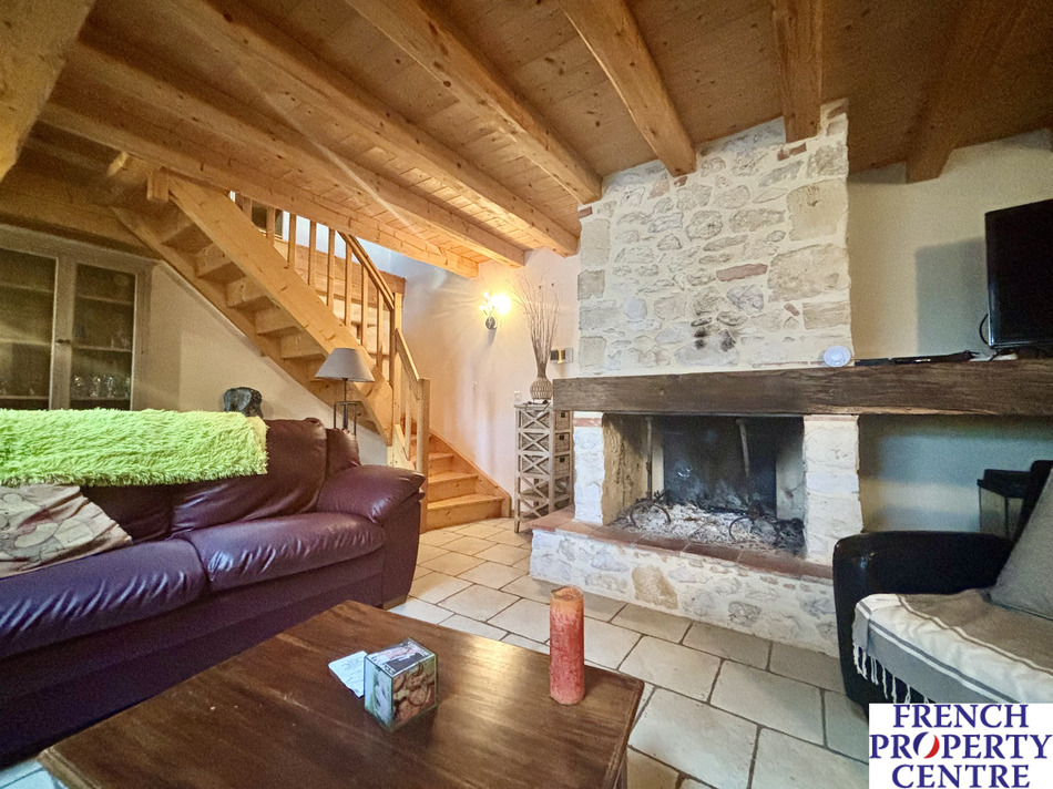 The converted barn offers a vast 61 m2 living room with a sitting area featuring an insert fireplace, two large bedrooms, a full bathroom and a separate toilet.