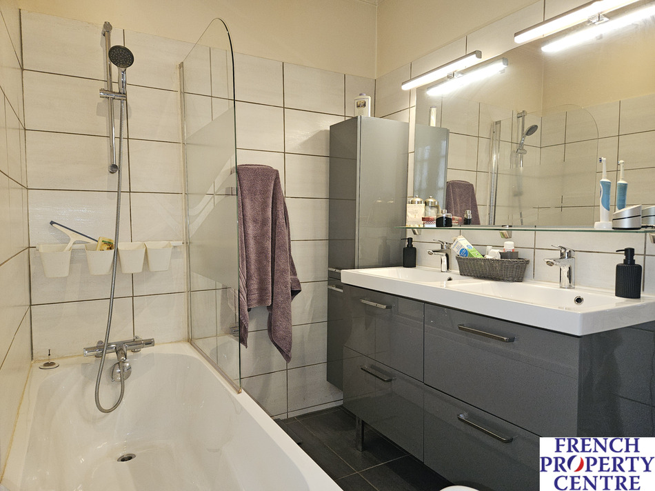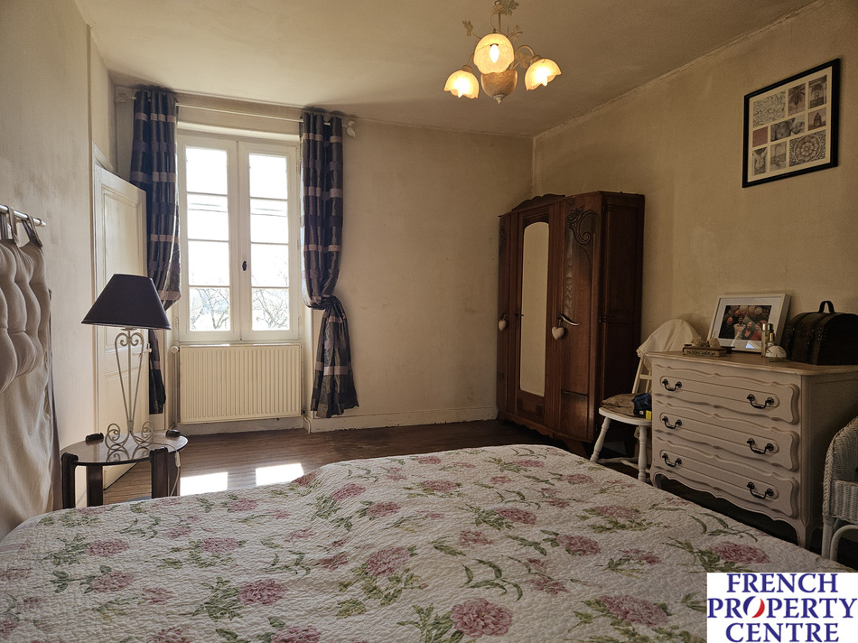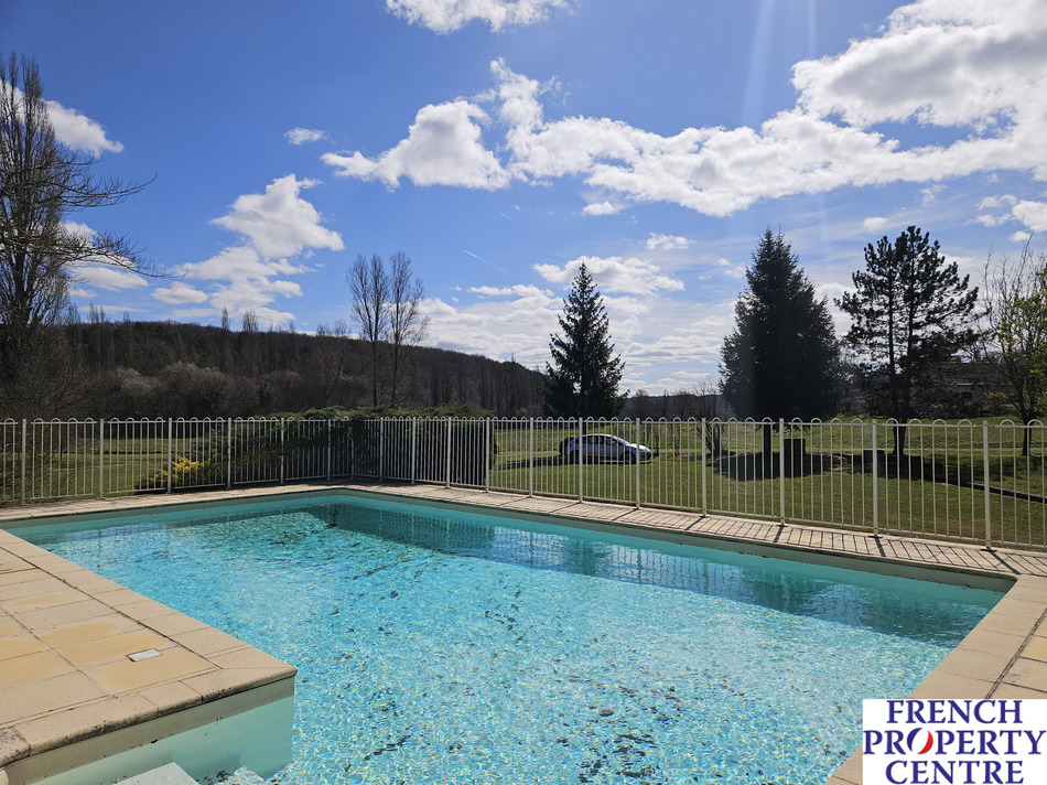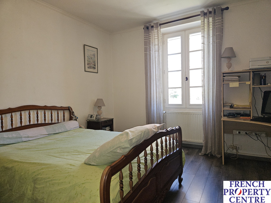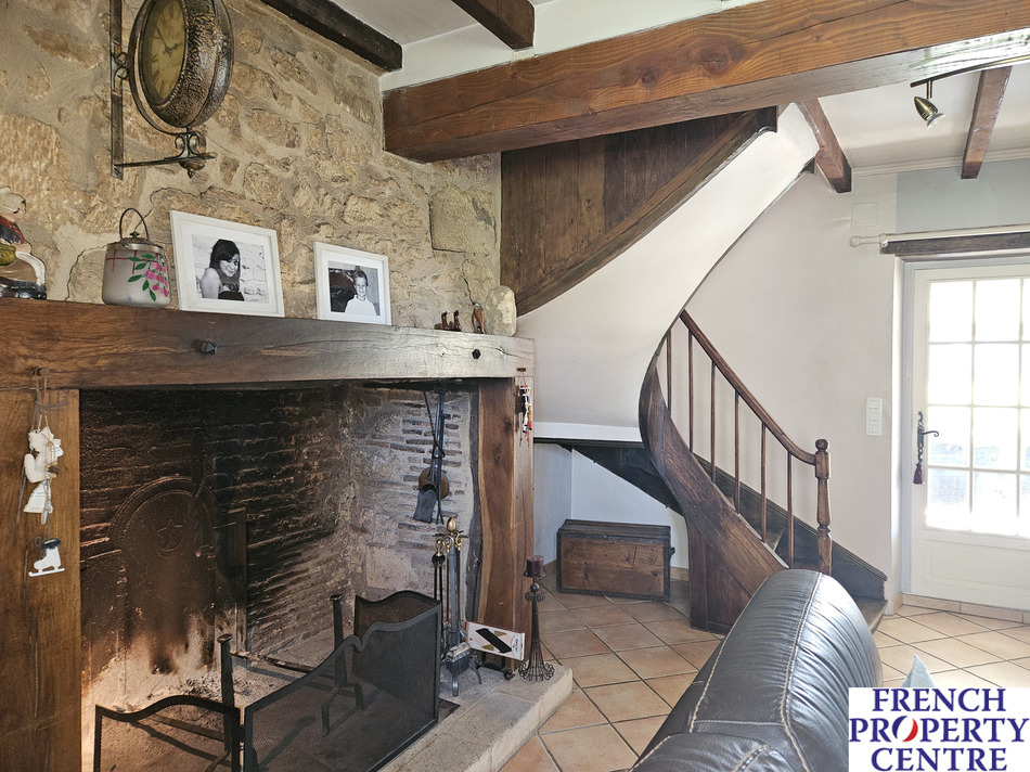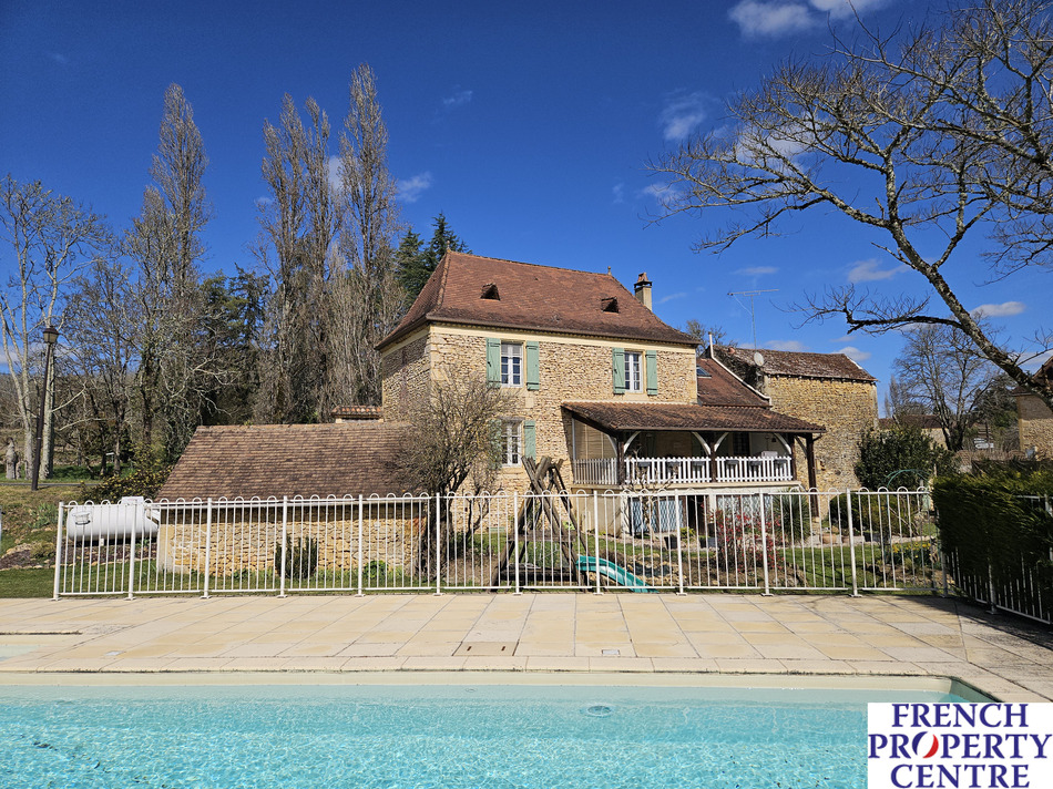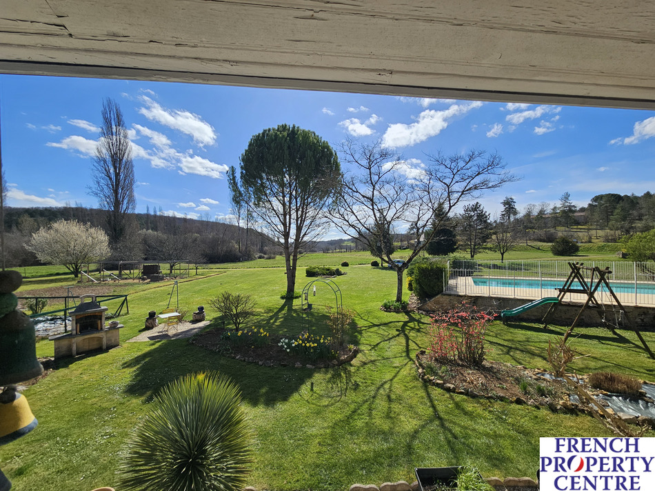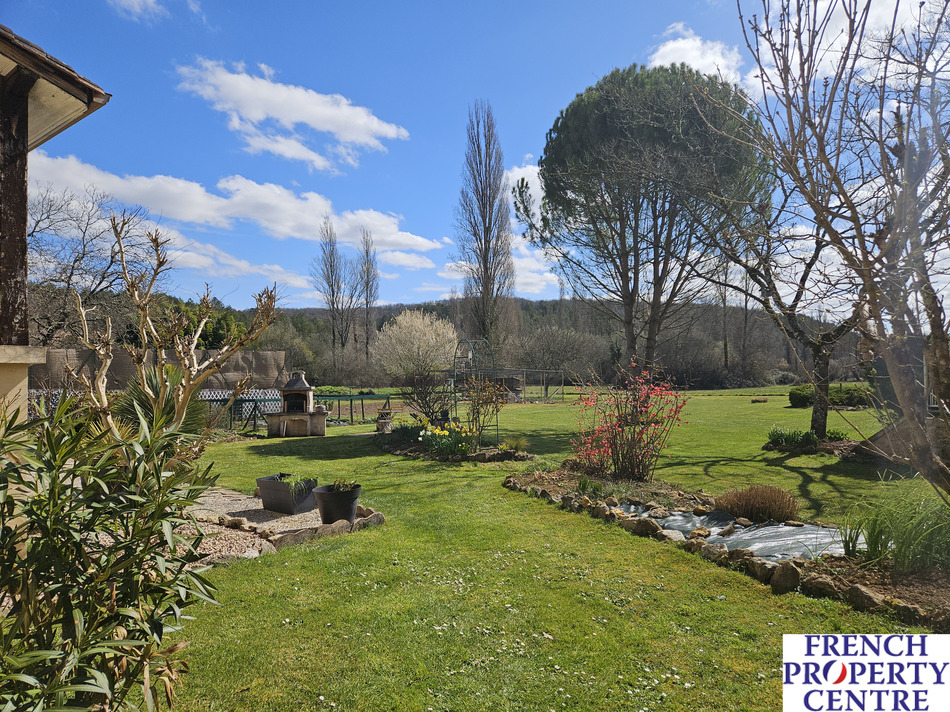 Characterfull village house with a barn/garage, outbuildings, overlooking a large pool and mature gardens with a stream running true it. the land is in total. almost 1 Ha,(this includes a seperate part of woodland on the hills nearby). This stone house is composed of a dining/living room and a seperate kitchen where each room has access to a sunny covered balcony. There is a bedroom on the ground floor with a shower room/toilet . Upstairs, 3 spacious bedrooms, a bathroom, and a WC. The barn has a workshop with a toilet, a laundry room, and a storage room with access to the mezzanine and another spare room. This spaces allows further conversion to extend the house. Gaz central heating. A MUST SEE !