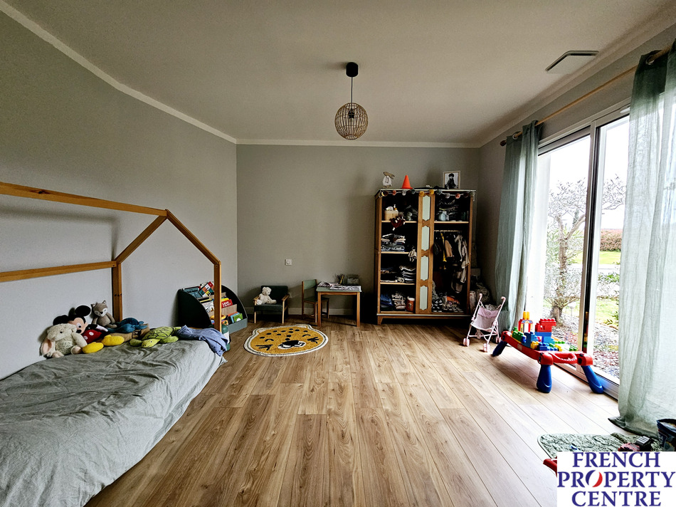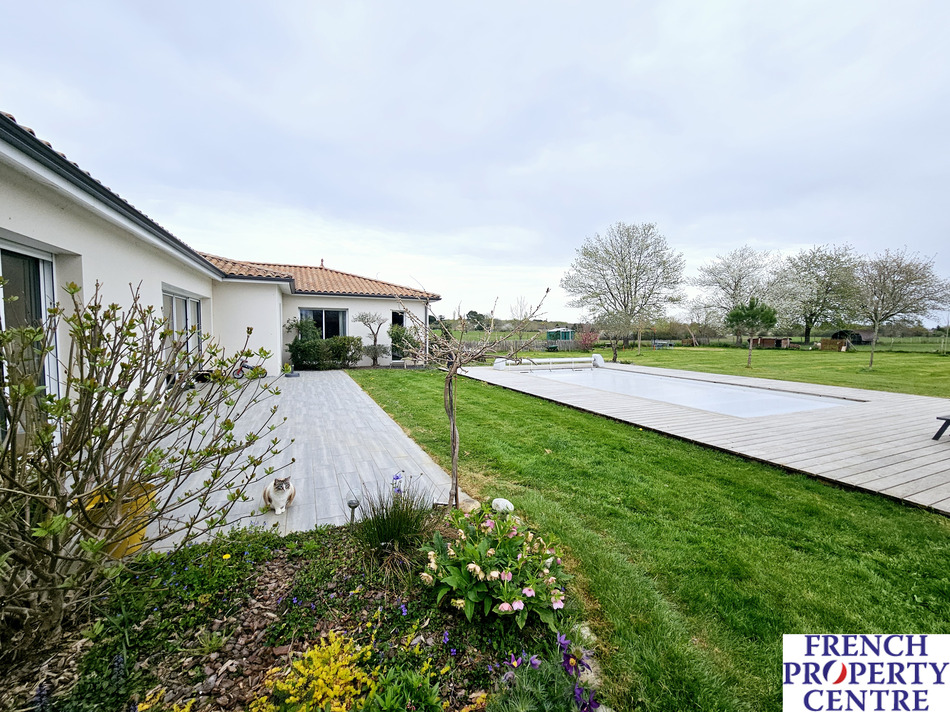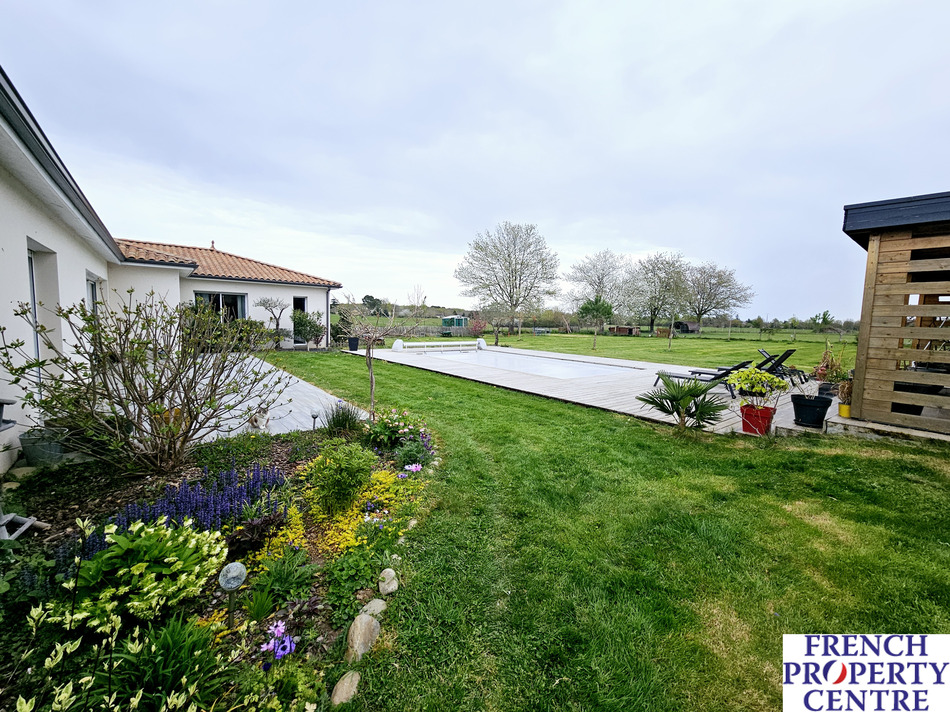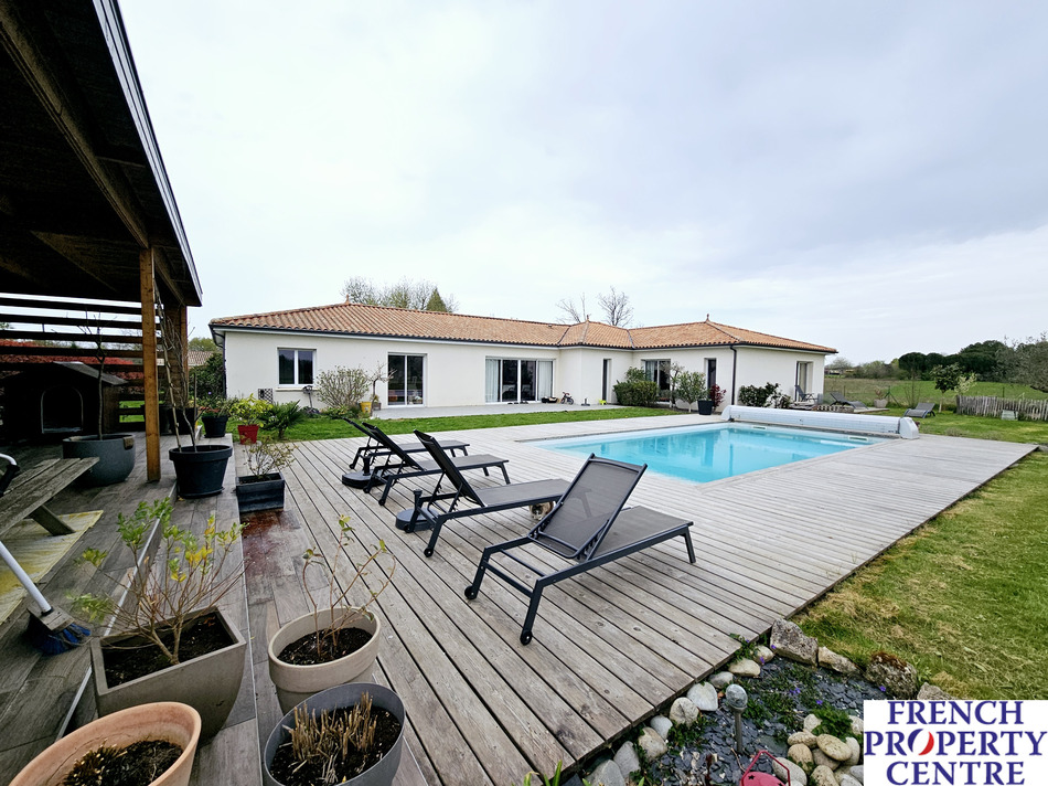 This charming single-storey house offers a modern and spacious design, located conveniently near shops and just a short distance from Bergerac. The house is ideal for a large family or for a seasonal rental project, with its practical layout featuring easily separable wings. With 7 bedrooms, including a luxurious master bedroom with en-suite bathroom and walk in wardrobe, the house provides ample space for comfortable living. The living room is bright and airy, thanks to a bay window that brings in natural light. The house also features a modern, open-plan kitchen, 1 bathroom with a walk-in shower and bath, 2 shower rooms, and 3 toilets. Outside, the beautiful landscaped grounds offer a pool area with a large terrace and a heated saltwater pool, providing a serene and relaxing retreat. The house is in move-in condition, allowing you to enjoy the peaceful surroundings without any immediate renovations.