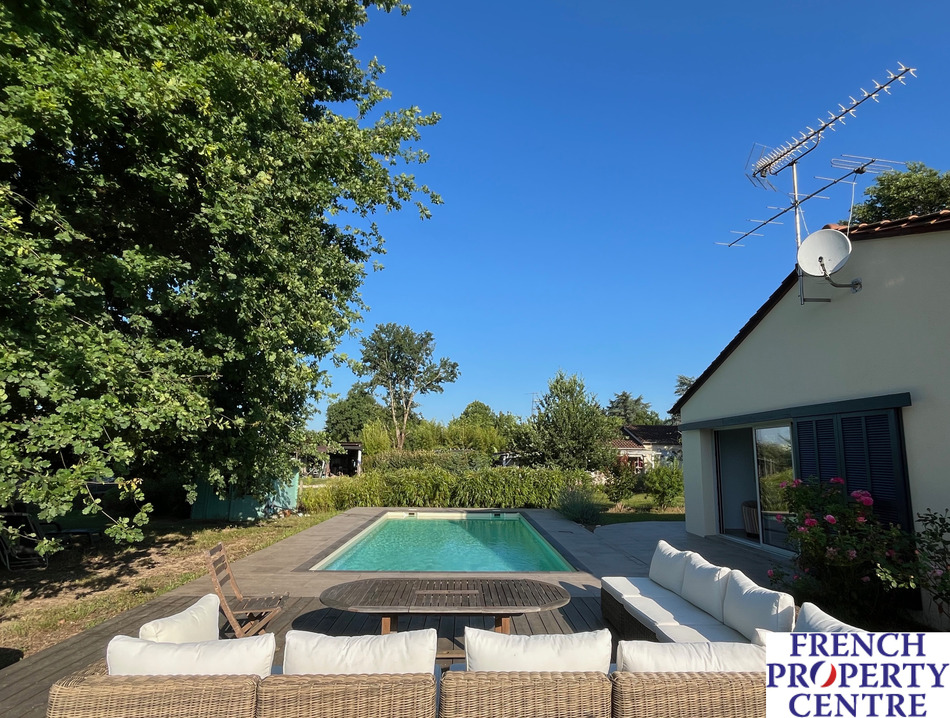 With 140m2 of living space and a 2000m2 enclosed garden, this single-story 4 bedroom family home is bathed in light in both summer and winter and invites relaxation with its various french doors to the garden, terraces, and swimming pool. 7km West of Bergerac, ideally located near the village (school and amenities)