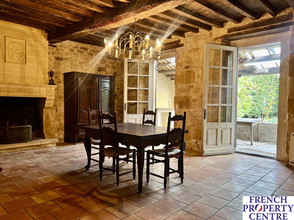 MONPAZiER: Stone house in the heart of the bastide with a 700 m2 garden with trees and flowers, enclosed by walls. The house, approximately 280 m2, is spread over two floors. On the ground floor, there is an entrance hall, a corridor leading to a first living room with a bar, a second living room of 23 m2 with a fireplace, and an open-plan, fully equipped kitchen with a large open fireplace, an old bread oven and access to the dining room. A beautiful wooden staircase leads upstairs to a large bedroom on the street side with two windows, a fireplace and a bathroom, three bedrooms on the garden side and an old bathroom. The attic is convertible. A 23m2 garage is attached on the street side and has a laundry room. This characterful house is ideal as a main residence, second home or hospitality project. its privileged location in the heart of Monpazier, one of the most beautiful villages in France, allows you to enjoy all the shops and services on foot. A rare property to be discovered without delay.