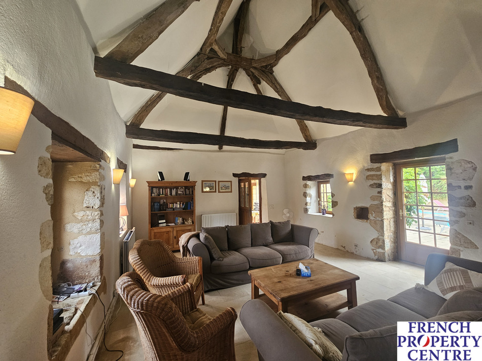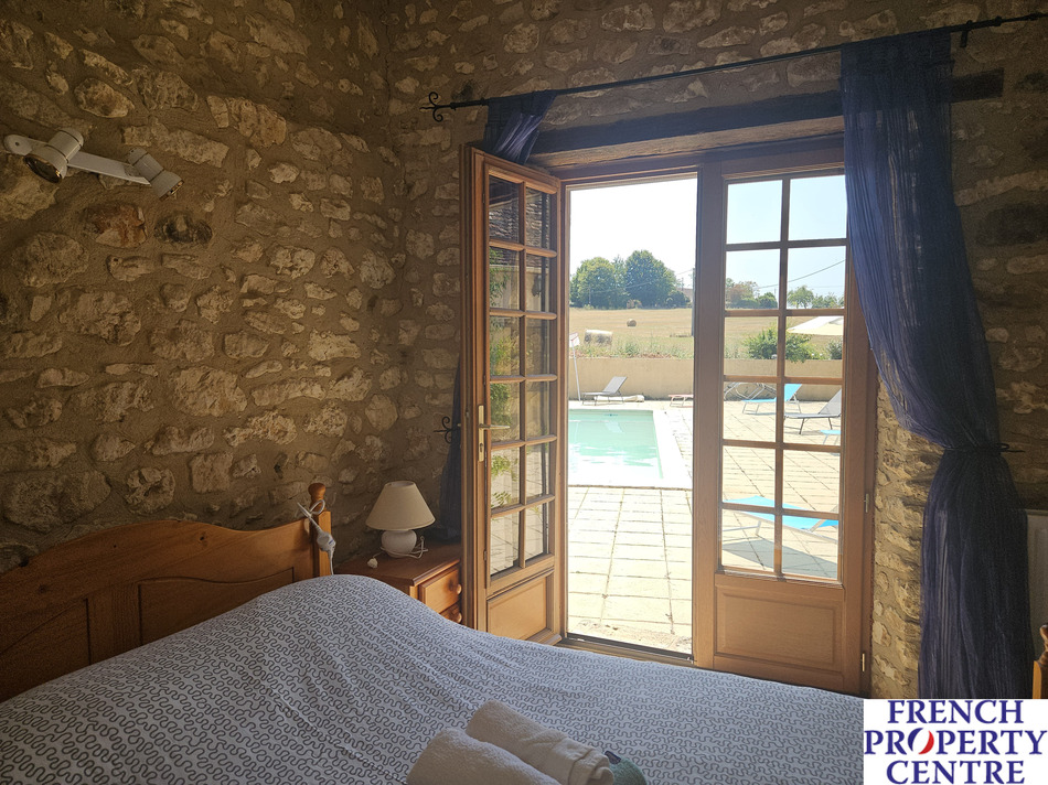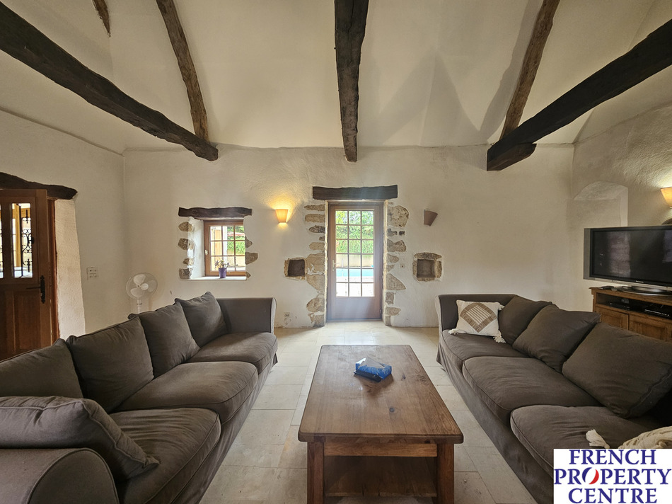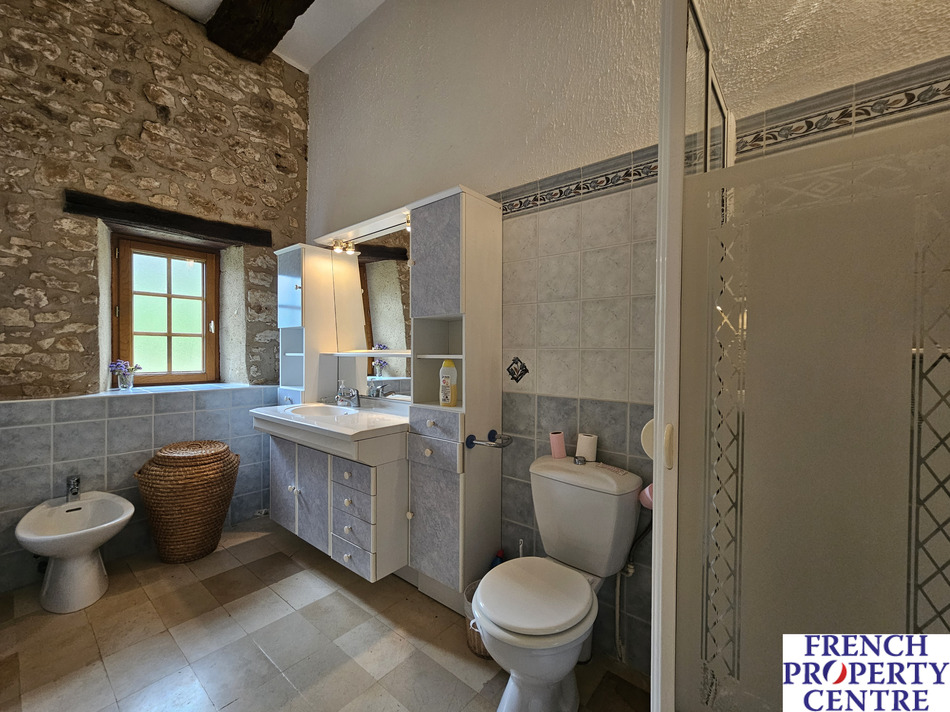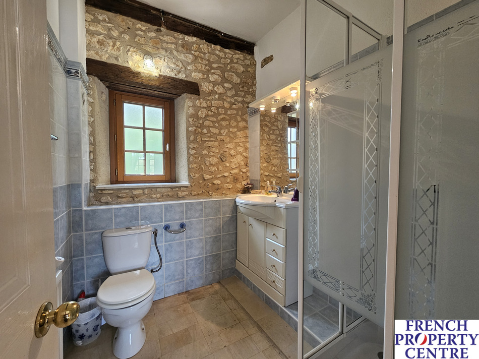 in a very quiet environment, at the end of a long wooded driveway, discover this authentic stone property, renovated and currently used as a holiday home. Comprising, on the ground floor, Entrance hall, kitchen, dining room, living room with wood stove, shower room, 3 bedrooms (2 x bedrooms with adjoining shower room). Upstairs, 2 attic bedrooms, and shower room. Attached garage. Swimming pool, 10x5 with 1.7 hectares of land.