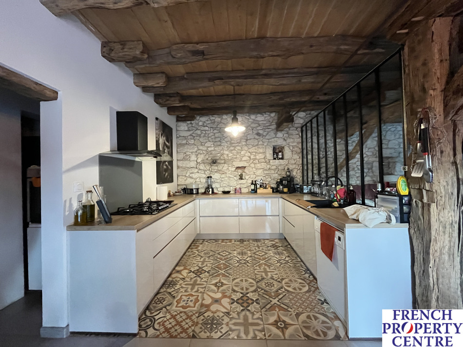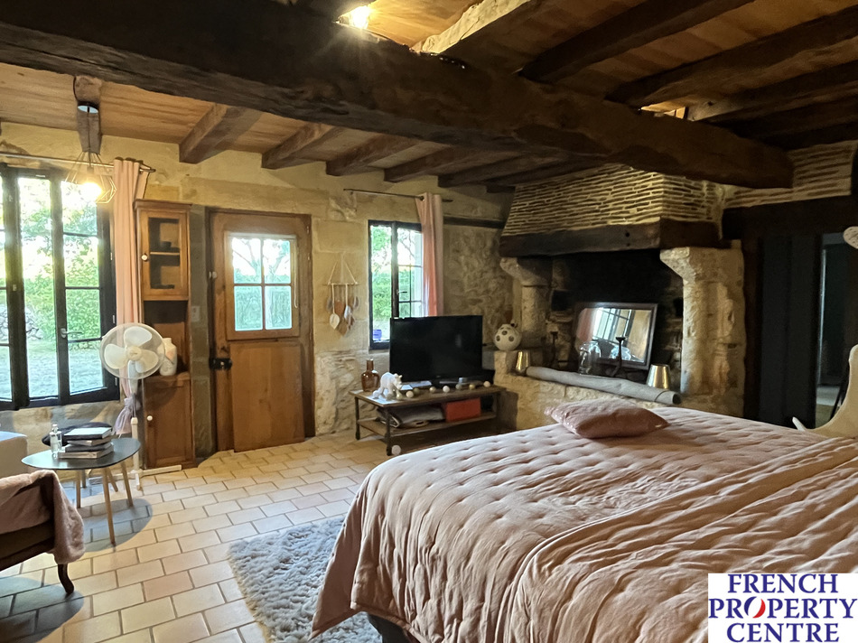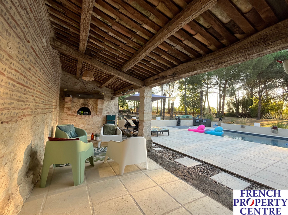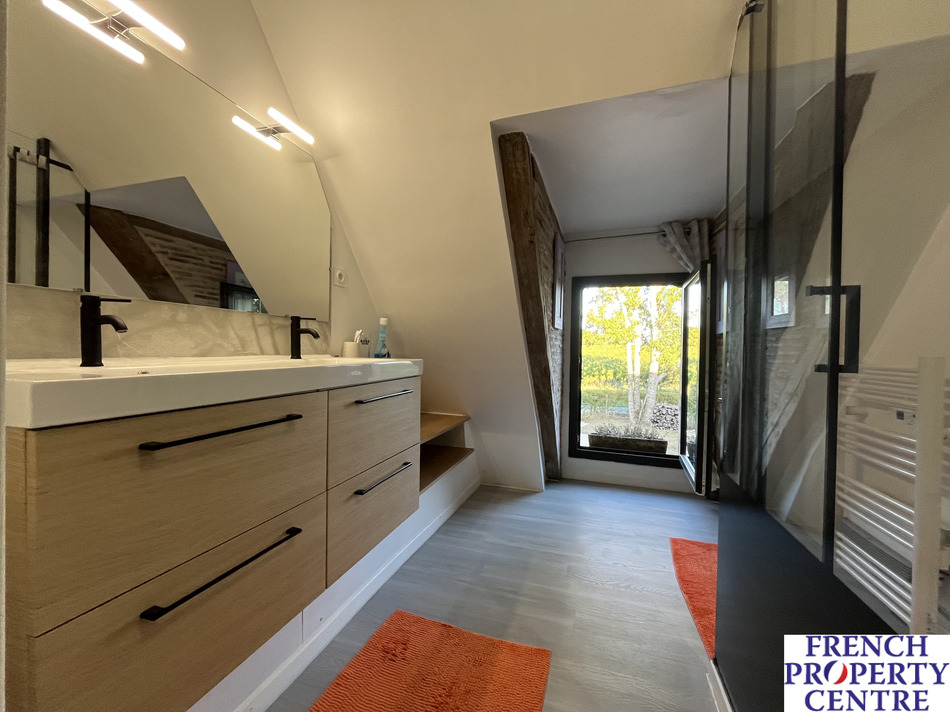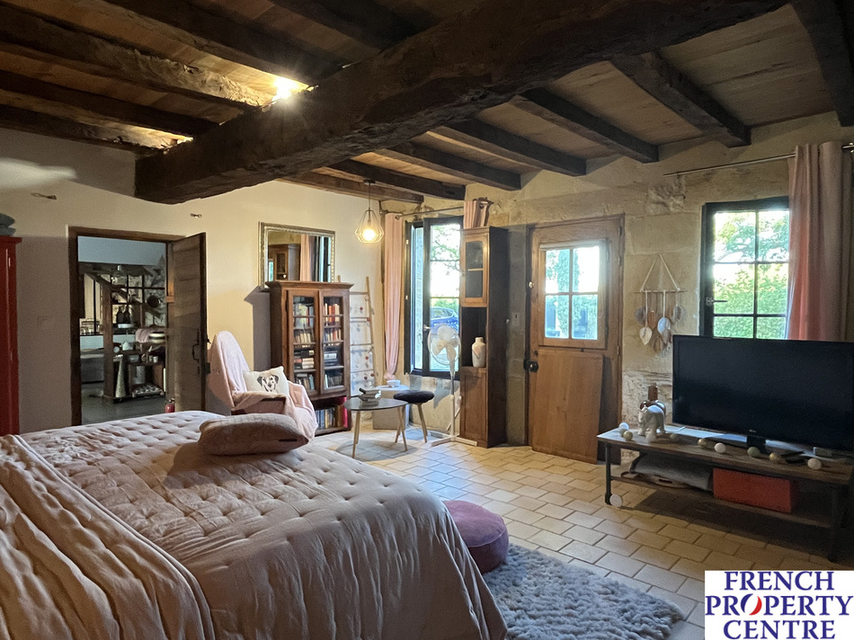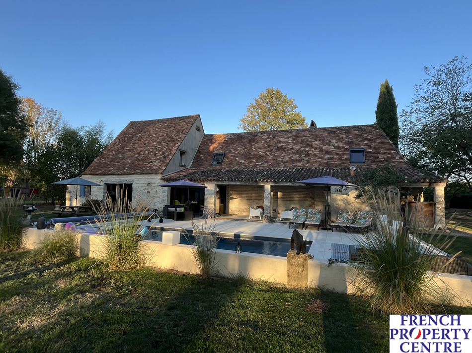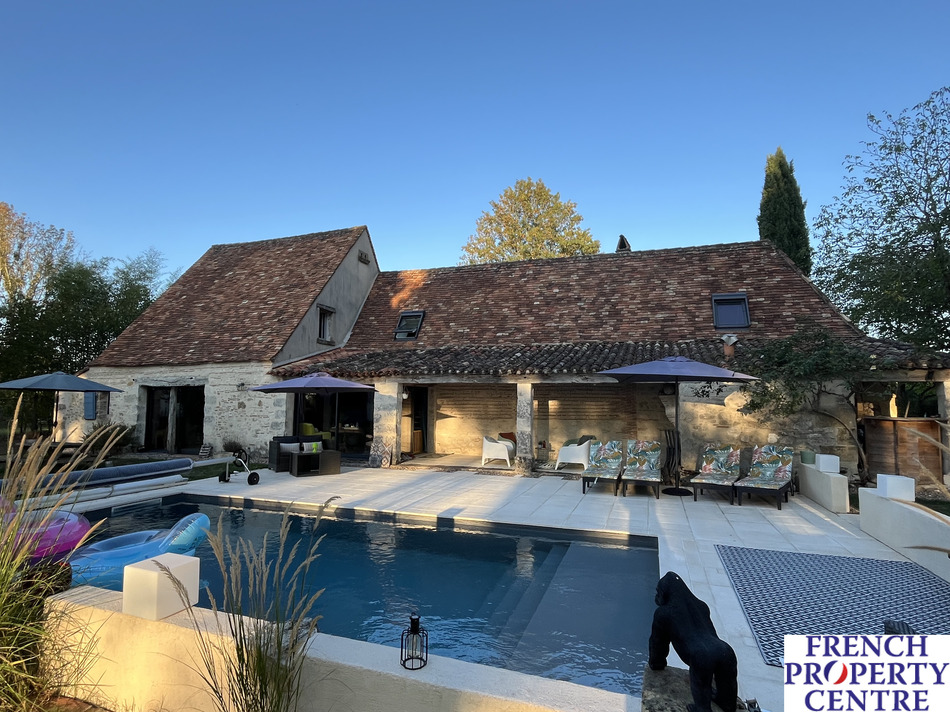 Modernity and authenticity are words that perfectly describe this renovation of an old farm and its barn, with a heated swimming pool and a West facing covered terrace. Mix of exposed stone, wood and hints of colours, 194m2 including on the ground floor a 78m2 living room with open plan kitchen overlooking the park with three bay windows, pantry, laundry room, a master bedroom with separate WC and a 20m2 en-suite shower room/dressing room, and upstairs a landing, three attic bedrooms, a WC and a shower room. Extra space presently used as an attic. Outside, a 200m2 metal frame open shed with a closed part for storage. 6000m2 of wooded park in a very quiet agricultural zone. A stone's throw from Bergerac. A must see!