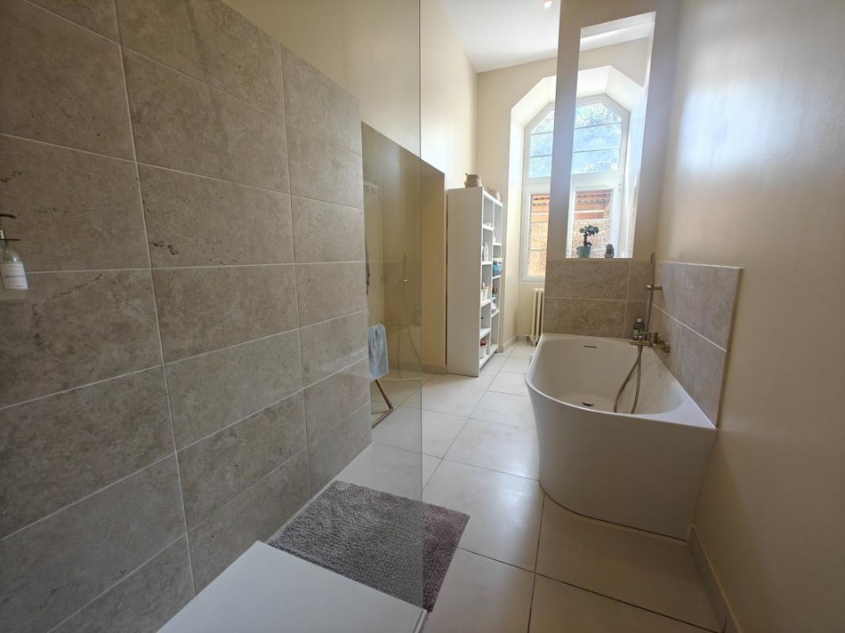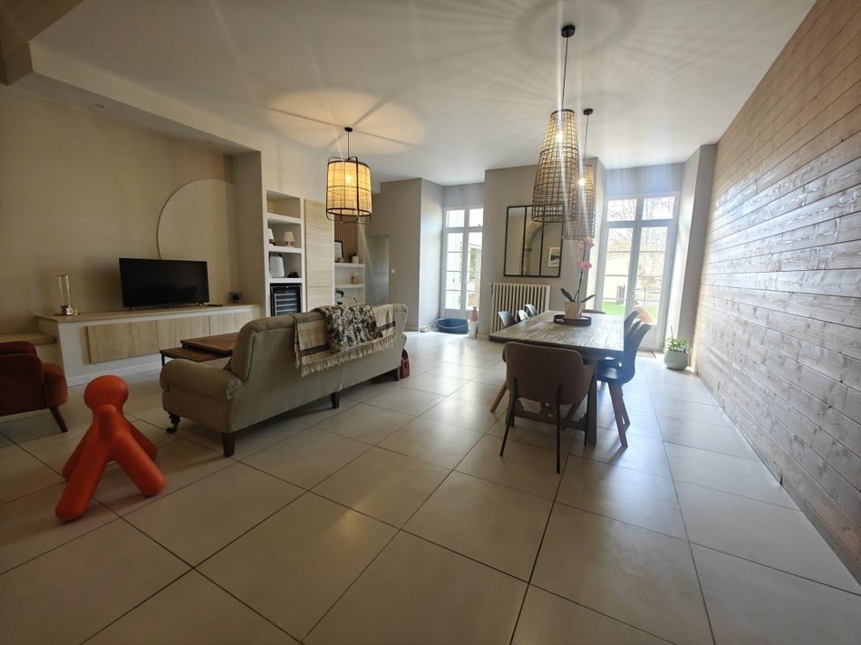 A stone's throw from the town center, discover this character house of 174.60 m2, perfectly renovated, combining old-world charm and modern comfort. Spacious and bright living room of 45.3 m2 opening onto the outdoor terrace, modern and fully equipped kitchen, two large bedrooms with built-in storage, bathroom renovated in 2025 with bathtub, shower and double sink, pantry, laundry room and separate toilet for more practicality. Upstairs, an office area with built-in library and a master suite with private shower room and toilet. Outside, wooden terrace of approximately 24 m2 ideal for summer meals, salt water swimming pool with pool house of 15 m2, and secure garage of 39 m2 with automatic gate. Mains gas heating (recent boiler from 2020). Recent renovation work. Quiet neighborhood, close to schools and shops.