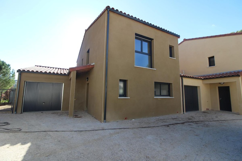 New villa, 115m2 living space, 30m2 garage, 47m2 wooden terrace, partly covered, beautiful features, reduced notary fees. Ground floor: large living room with beautiful fitted kitchen over 50m2, WC. Upstairs there are 3 bedrooms. Services: -ducted heating -equipped kitchen -polished concrete floor -parquet flooring in all rooms -decorative tiles in the bathroom -fenced property -garden to organize