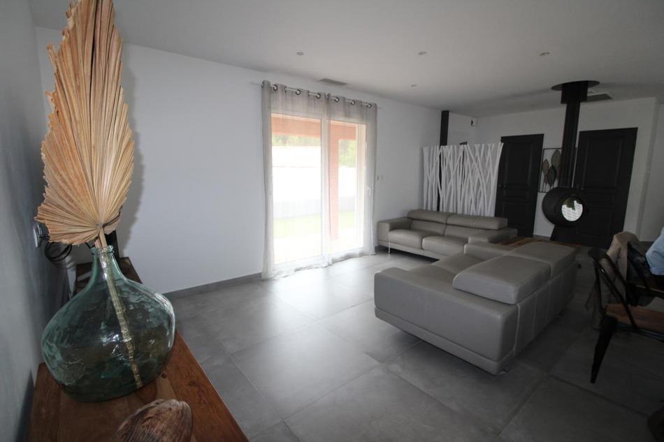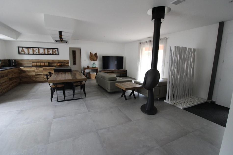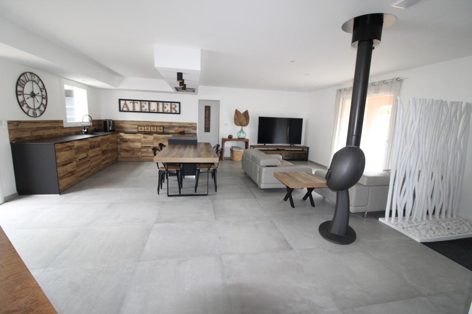 The charm of perfection: a single-story villa offering comfort and modern amenities. Large living room with fully equipped kitchen, 32m2 master suite with dressing room and shower room, and two further bedrooms, one with an en-suite shower room, laundry room. 24m2 garage, 39m2 lean-to. Stove, solar panels, heat pump, thermodynamic water heater, water softener. Independent studio 45m2, kitchen, living room, bedroom, bathroom. Indoor swimming pool. The entire property is fenced, the garden is perfectly maintained, modern, and in harmony with the whole.