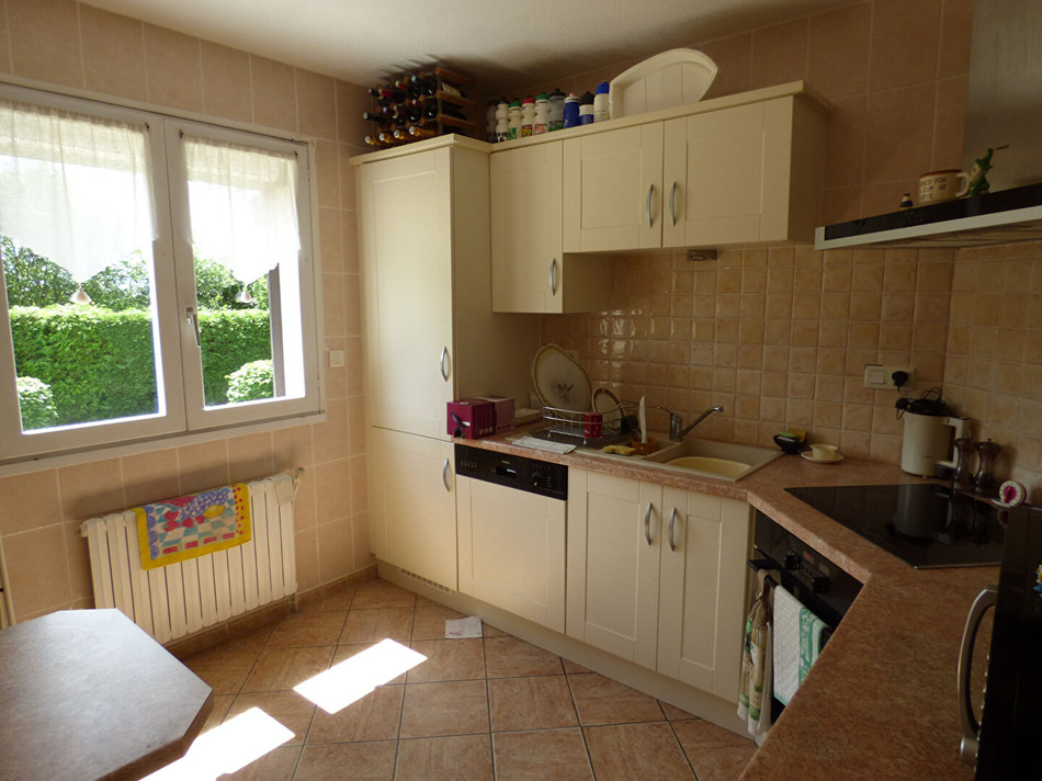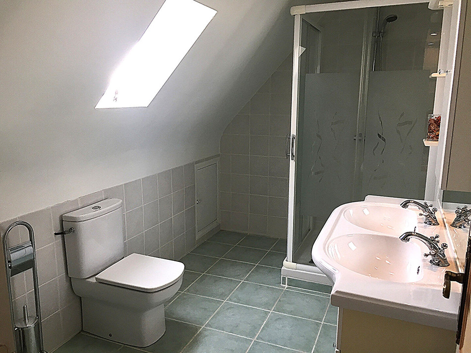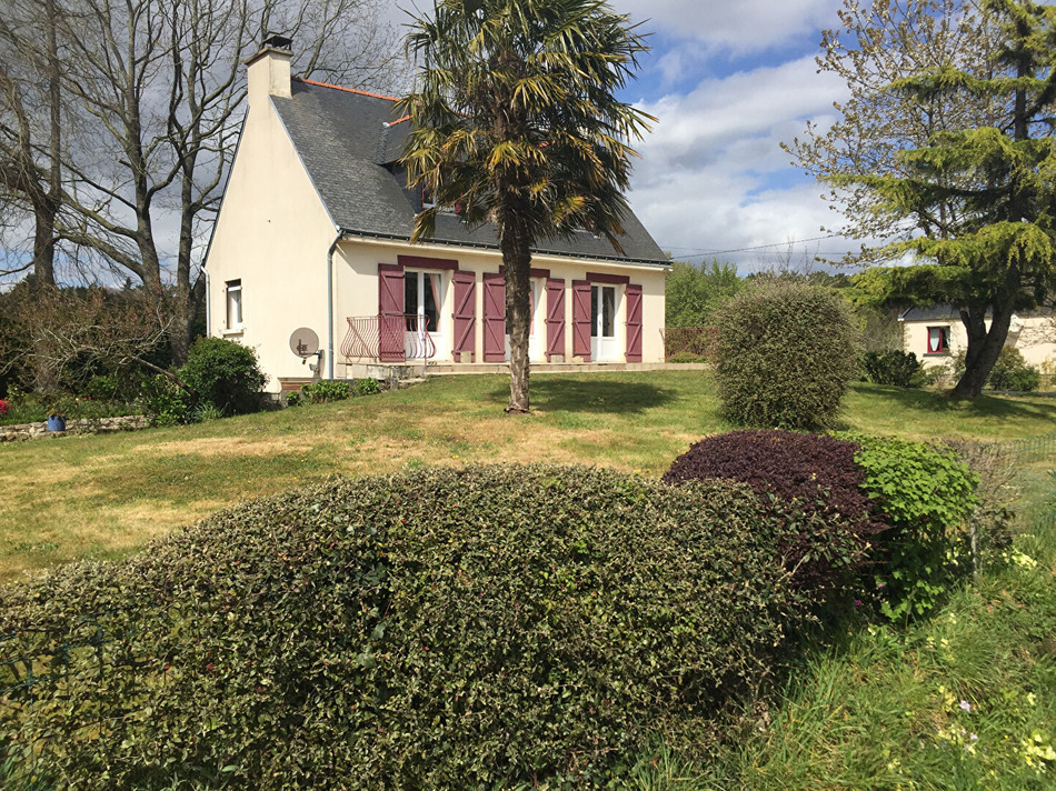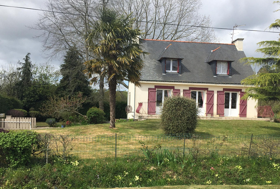 Lovely detached house with full basement facility for sale very close to the village of GUEGON with shops. Living room/lounge with fireplace, terrace. Fitted kitchen, shower room + wc Large entrance. wc Small ,storage room and one bedroom. Upstairs: beautiful staircase, large landing, two bedrooms, an office, another shower room with wc. Full basement with garage, boiler room (oil), laundry room. Small courtyard for several vehicles, leasure garden, open view. All on 1583 m² of ground. (5.00 % fees incl. VAT at the buyer's expense.)