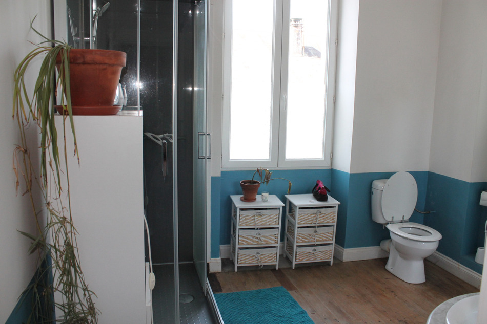 A l'étage : 3 chambres dont une avec salle de bains attenante , grande salle d'eau et toilettes .