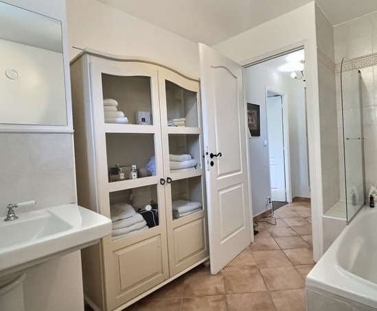 Downstairs, on the garden level, the generous master suite complete with dressing room and ensuite shower room opens onto a sunny terrace while a third bedroom also offers direct access to the terraces and pool. A large family bathroom, separate guest toilet, and direct access to the 24 m² garage with utility area complete this level.