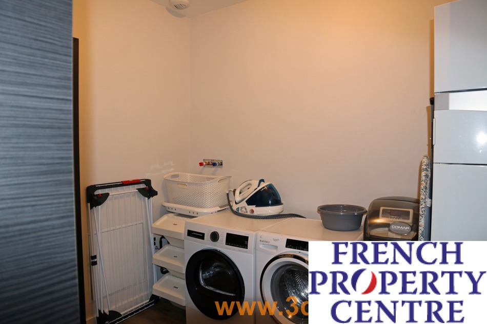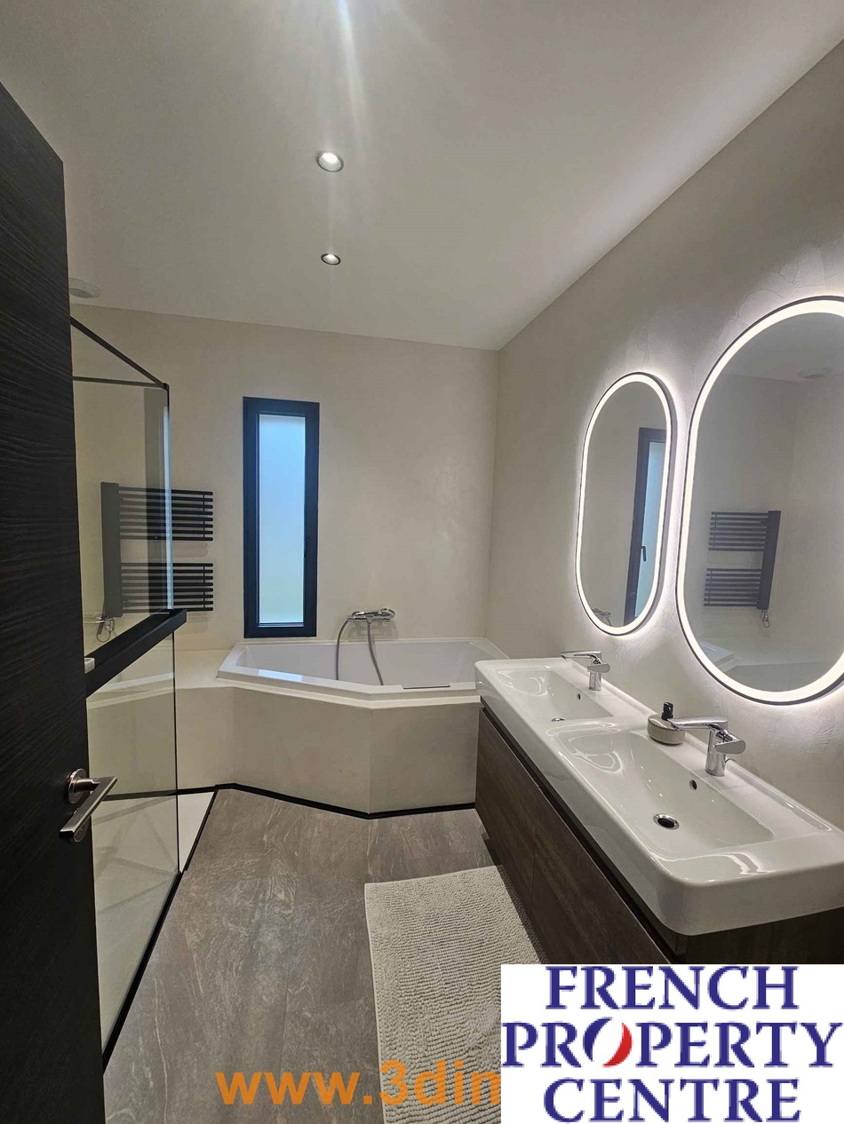 La salle de bains, séduit par sa double vasque, sa douche à l'italienne et sa baignoire, pour des moments de bien-être absolu. Deux WC suspendus (dont un avec lave-mains), un bureau de 9 m² et une buanderie pratique complètent cet ensemble, où chaque mètre carré a été optimisé pour votre confort.