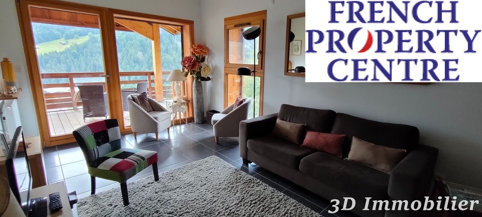 Il comprend une cuisine entièrement équipée ouverte sur un séjour lumineux avec accès au balcon et une vue imprenable sur la chaine des Aravis.