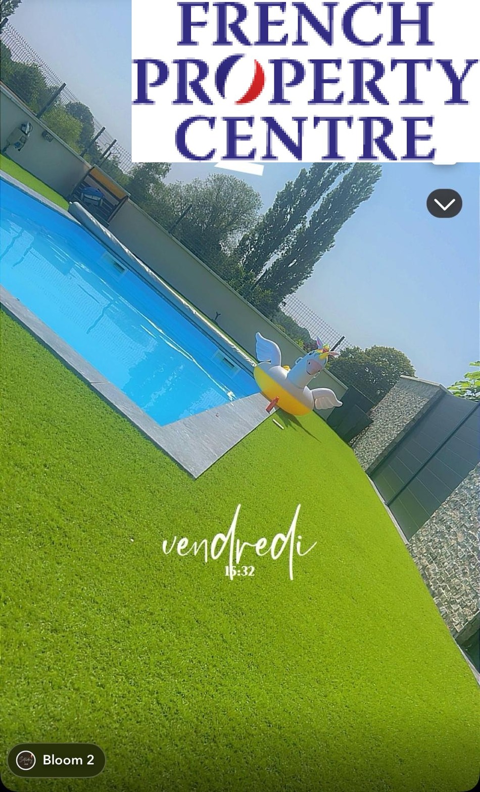 Agréable piscine de 6 X 3.50 chauffée avec sol gazon synthétique et brise vue, terrasse couverte carrelée, cour et parking,