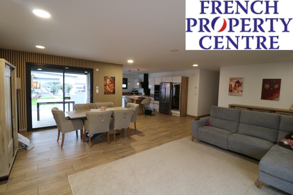 Découvrez cette maison contemporaine de plain-pied, en parfait état, offrant 143 m² habitables et un confort de vie remarquable. Située dans un environnement paisible, elle bénéficie de vastes dépendances et d'un terrain entièrement clos, idéal pour une installation immédiate et sans travaux.