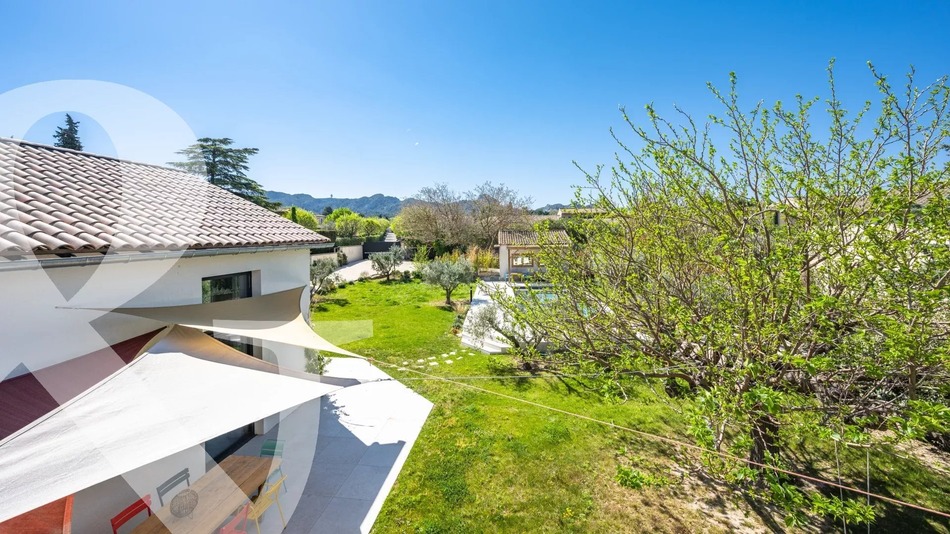 Just a stone's throw from the town centre, in a quiet and sought-after quarter of Saint-Rémy-de-Provence, this contemporary property, offering approximately 315m2 of living space (350m2 developed) showcases impressive volumes all enhanced by wonderful natural light throughout. The convivial open-plan living room comprises a well-equipped kitchen, a dining area and a lounge with large doors that give on to the south facing garden. Also on the ground floor are 4 bedrooms, 3 of which being generously sized master-suites. Up on the first floor are 2 further bedrooms with en-suite shower rooms, and a second reception area on the mezzanine, which is currently used as a billiard room. From the generous first floor terrace you have a glorious view of the Alpilles that overlooks the garden and the 11x4.5m heated pool with electric security cover. The pluses: two secure garages, reversible air-conditioning and underfloor heating / cooling, electric shutters with home automation system and electric gates. Given the space on offer and the excellent location of this property, it lends itself equally to being either a main residence or an easily maintained holiday home, with excellent seasonal rental potential.