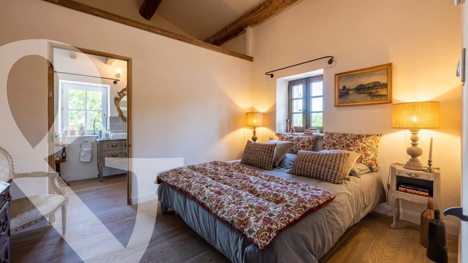 This magnificent and characterful farmhouse, restored with taste and refinement, is a little gem in the heart of the village. The owner has used reclaimed, period materials to give this property incredible charm, with old beams, stone floors and various architectural features from another era. The interior of the house has been completely transformed and the property comprises 2 buildings with a total living area of more than 260 m². The main part, offering around 166m² has a kitchen with dining area, a large living room with stone fireplace and, on the first floor there are 3 bedrooms, all of which are en-suite with their own shower room and private WC. An independent 95m² guest house can accommodate extended family and friends, where a comfortable stay in ensured due to its open-plan kitchen / living room and 2 bedrooms which share a shower room. The courtyard garden features a pretty 2x3.5 m pool and a terrace protected by a trellis, the perfect spot in which to relax and enjoy quality time in Provence.