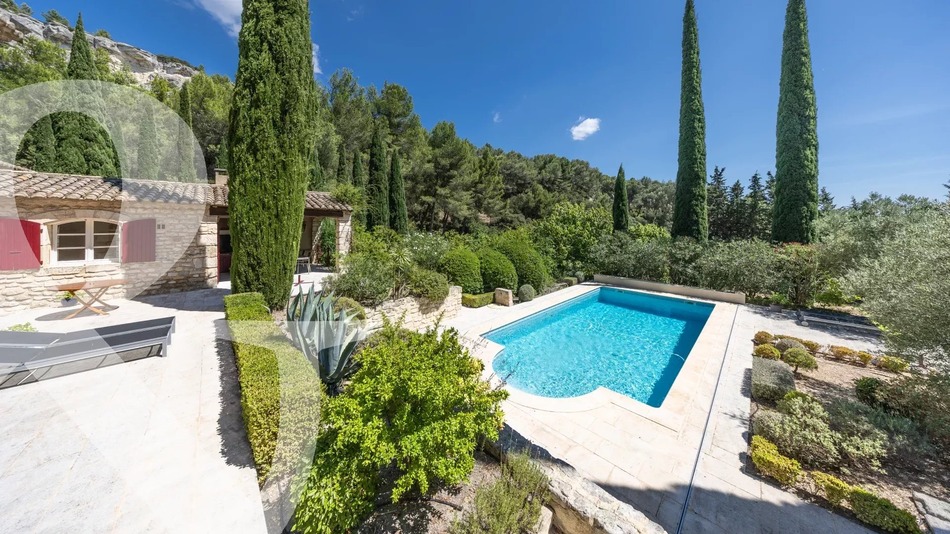 In the heart of the Alpilles, set in the valley around Les Baux de Provence, this fabulous stone-built property of around 183 m² offers all the charm and authenticity that you would hope to find in the Alpilles. Classic postcard Provence: on one hand, a magnificent stone farmhouse that has been built according to traditional artisan building methods and on the other hand different vistas of the immediate natural environment and onto the limestone rocks of this mythical landscape, one of which is listed. Set in a park of a little more than 1.5 hectares the grounds are an inspired mix between an attractively and sympathetically landscaped garden that borders the house and the wilder vegetation of the Alpilles with its unforgettable bouquet of pine, rosemary and thyme. And amidst this there is a discreetly positioned swimming pool, 11 x 5m with an electrical security cover. The property is composed of two parts: the main house comprises, on the ground floor, an inviting hallway with guest WC, a spacious sitting / living room with 'cathedral' ceiling and a kitchen that opens out onto a covered dining terrace with views over the gardens and landscape beyond. There is also an en-suite bedroom on this level. Up on the first floor there are 2 charming bedrooms, both enjoying their own covered terrace benefitting from stunning views of the Alpilles and which share the family bathroom. The second part is an independent apartment that offers a living room (kitchen, sitting, dining) a bedroom and bathroom. Between the main house and the apartment is a garage with tiled floor of 24 m². Under the property is a vast basement of more than 70 m² which offers a tremendous amount of storage space. The large convivial terrace, with one part that is covered for summer dining and where there is also a bbq, enjoys views over the surrounding landscape, whilst a pétanque pitch, various parking spaces and an electrical car-charging point complete this superb home. The enchanted setting and the character of the farmhouse make this a truly exceptional property.