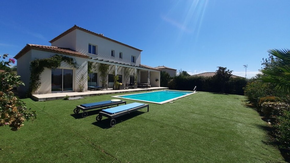 Exterior = Large terrace of 70 m2 and heated pool (11x4m, chlorine and electrolysis) with electric cover + programmable irrigation system + beautiful flowery hedges all around the property + breathtaking views + parking area.