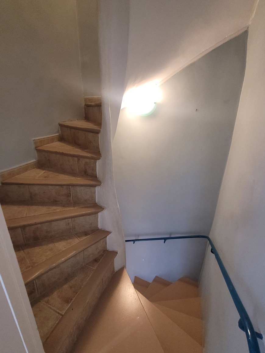 Ground = Entrance hall leading to a 23 m2 living room/kitchen with wood-burning stove and space for a small table and 2/3 chairs in front of the French windows (terrace not included in the property registration).