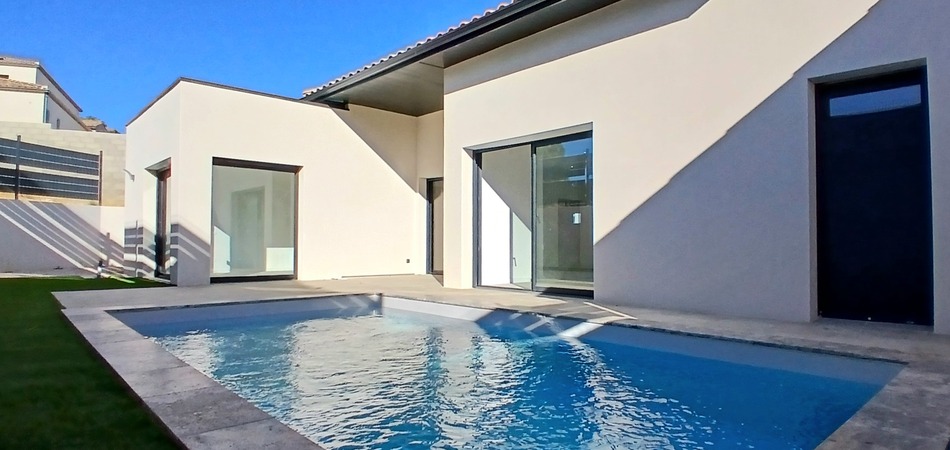 Elegant new build single-storey villa (built in 2025) offering a living area of approximately 123 m2. It comprises a spacious and exceptionally bright 60 m2 living room with an open-plan kitchen, a laundry room, 3 bedrooms including a master suite, 2 shower rooms, as well as a garage. The property sits on a fully enclosed 413 m2 plot, elegant and easy to maintain, featuring a swimming pool and two private parking spaces. Peaceful setting, on the heights of the village, enjoying beautiful surrounding views.