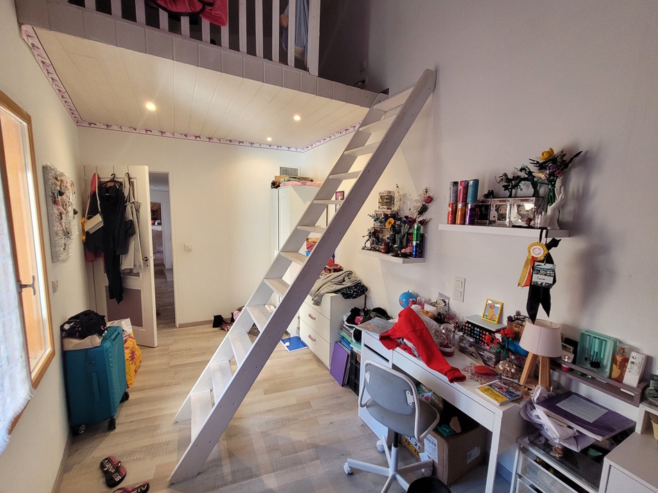 1st = 12 m2 entrance hall with stairs leading to a roof terrace + 36 m2 living room with 15 m2 mezzanine + 28 m2 kitchen (fixed units, electric oven, extractor hood, hob, sink) + 11.5 m2 bedroom with mezzanine bed + 15.9 m2 bedroom + 7 m2 bathroom (bath, 2 sinks, WC).