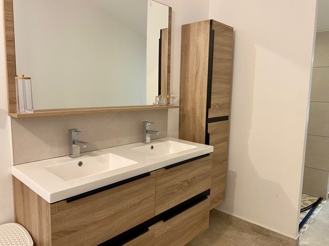1st = Luminous brand new fitted kitchen (units, oven, hob, fridge) of 13 m2 with a storage cupboard and direct access to the terrace + west facing terrace of 18 m2, not overlooked, perfect for relaxing + hallway of 1.5 m2 + open lounge and dining area of 33 m2 with pointed stone walls, revealed beams and 2 large glass doors leading onto balconies, allowing for lots of natural light + master bedroom of 13.5 m2 with ensuite of 5.2 m2 (Italian shower, sink) and dressing room + separate WC of 1.5 m2.