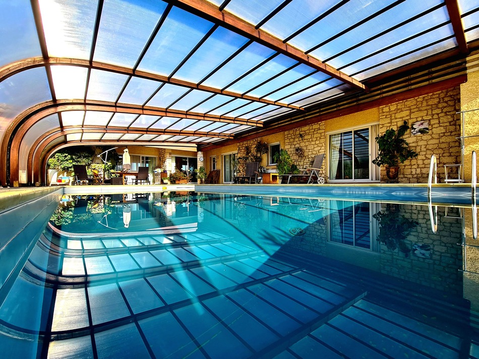 Exterior = Pleasant wooded grounds of 3202 m2 including a stone garden shed + rounded Gard stone fountain on the lawn area, supplied with water by a pump system + vegetable garden + terrace with barbecue + pool area of almost 150 m2 (heat pump-heated pool, 10×5m, chlorine, refurbished in 2023, under guarantee for 10 years and new pump system) + 2 outdoor shower rooms (shower, WC, washbasin): one on the pool side and one on the garage side.