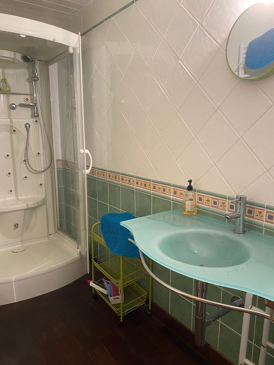 1st = Equipped kitchen of 16,5 m2 (oven, hob, fridge, extractor) with original tiling, and a chimney that also heats the second floor + bathroom of 6,5 m2 (bath, WC, basin) + very bright large lounge of 30 m2 with two bay windows, one opening up to a terrace of 7 m2, the other onto a large terrace of 40 m2 comprising a 3,5×5,5m heated tiled pool.