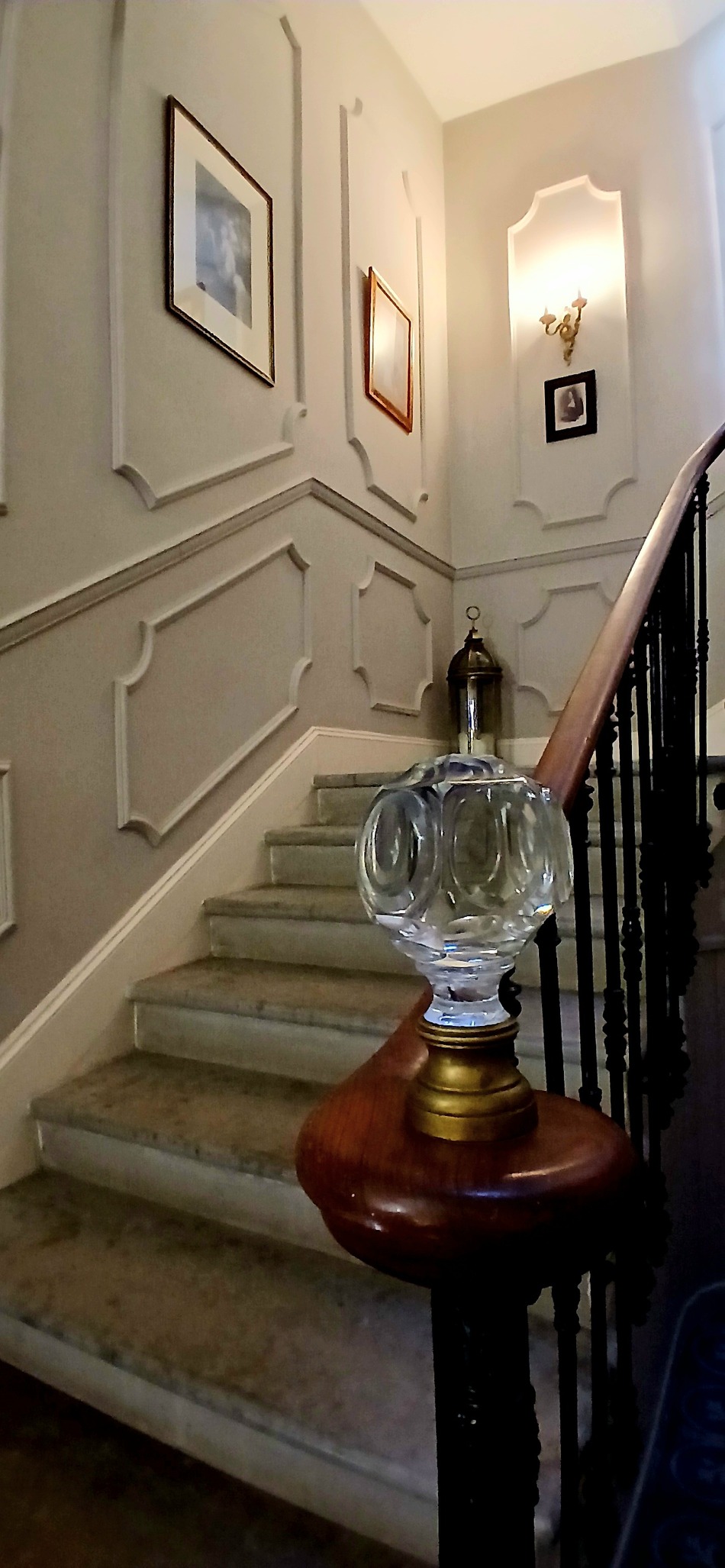 1st = An elegant original stone staircase leads to a hall of 18 m2 + hall of 3.77 m2 with built-in cupboards + shower room of 5.41 m2 (shower, vanity unit, bidet, WC, heated towel rail) + bathroom of 8.47 m2 (corner bathtub, double vanity unit, WC) + large bedroom of 24 m2 with marble fireplace and balcony + bedroom of 23.27 m2 with balcony, marble fireplace and cupboard of 3.60 m2 + bedroom of 21.67 m2 with marble fireplace and cupboard of 3 m2.