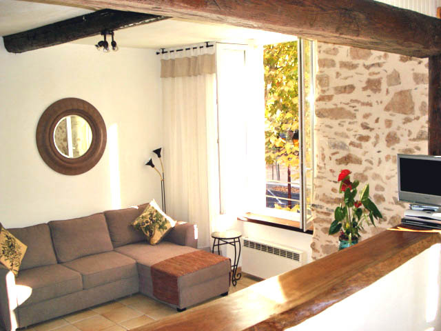 2nd = Landing of 1.5 m2 + 1 bedroom apartment (Les Oliviers) of approximately 60 m2 in total, offering a bright lounge with kitchen and dining area of 38 m2 with large window looking at the square (table extends and can seat 8 people), one double-bedroom of 14 m2 with fitted wardrobe and bathroom of 8 m2 (corner bath, shower, handbasin and separate WC).