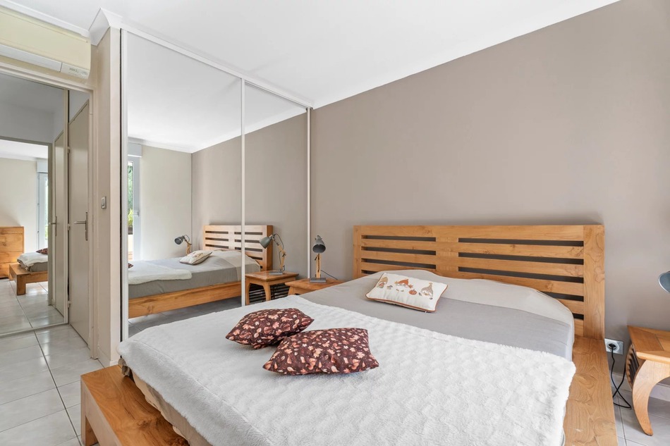In a small, well-maintained residential building withing walking distance to shops, come and discover this cozy 3-room apartment.It features an entrance hall with built-in storage, a bright living and dining area with an open-plan, fully equipped kitchen in a contemporary style. The sleeping area offers two bedrooms with built-in wardrobes. All rooms open onto a stunning 27 sqm terrace, perfectly oriented, completely private, and absolutely quiet. A private garage adds to the comfort of this property.