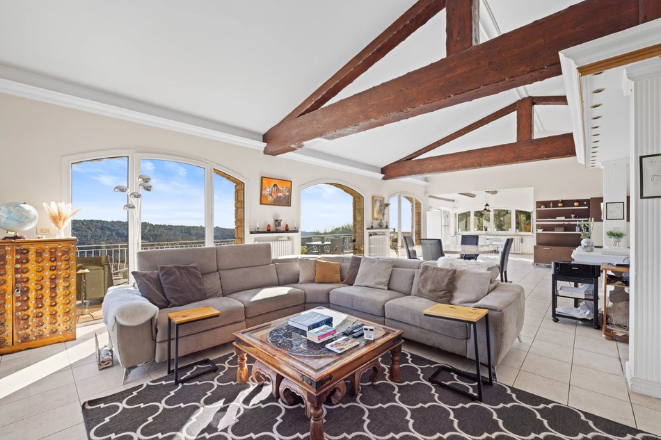Ideally located between Vence and Saint-Jeannet, in a natural, preserved and confidential environment, this exceptional property offers a unique residential experience, enhanced by spectacular panoramic views of the Mediterranean Sea, the green hills and the emblematic Baous of the Nice hinterland. With around 194 m² of living space, the villa is distinguished by its spaciousness, elegant architecture and omnipresent luminosity. The sumptuous 100 m² reception room, combining living room, dining room and open kitchen, boasts remarkably high ceilings, exposed beams and large bay windows, creating a perfect continuity between interior and exterior spaces. This living space opens onto a vast 45 m² terrace, a veritable belvedere suspended in front of an exceptional 180° panorama, an ideal setting for elegant receptions or moments of absolute relaxation in a natural setting of rare beauty. The sleeping area features a first bedroom with en-suite bathroom, plus two additional bedrooms with en-suite shower rooms. Set in landscaped grounds of approx. 2,767 m², the property offers premium amenities: 10 x 5 m heated saltwater swimming pool, carefully landscaped outdoor areas, carport and workshop. An independent studio of approx. 26 m², with private access, completes this rare property. It's an ideal solution for guests or staff, or for discreet, controlled rental use. A confidential and exclusive address, combining spectacular volumes, natural light and exceptional views, just a few minutes from the most sought-after villages in the Nice hinterland and within easy reach of the Côte d'Azur. Information on the risks to which this property is exposed is available on the Géorisques website.