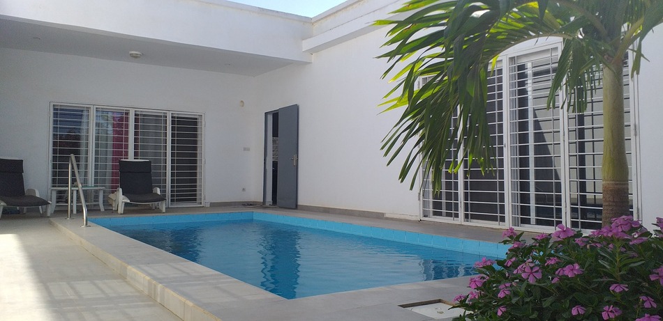 Located in a quiet and residential area, close to all amenities, this contemporary house of 154 m2 is nestled in a 300 m2 garden with a pretty swimming pool. It consists of a living / dining room opening onto a fully equipped American kitchen, with a small laundry room and 1 guest toilet. The 2 spacious bedrooms each have their own adjoining bathroom, and direct access to the circular terrace and the swimming pool. The villa is air-conditioned and sold furnished, with an alarm. Indoor parking, well, water reserve. OUR OPINION: A small quality property at an affordable price!