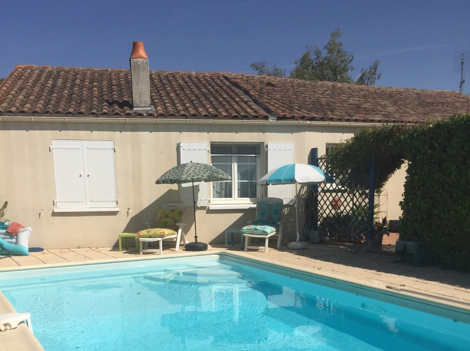 In a village with a magnificent castle, this detached house with basement offers beautiful open views of the countryside. It is located just 5 minutes from the historic town of Saint Jean d'Angely where there are all shops, train station and motorway. The house is surrounded by gardens At the front, an easy-to-maintain gravelled area with flower pots and a silver birch tree. On the side, there is access to the rear garden with a wooden shed. The rear garden offers stunning views over the countryside and is fully enclosed. There is a covered terrace and swimming pool area which is completely private. Planted with mature shrubs, wisteria and an olive tree, the gardens are charming and easy to manage. The house consists of an entrance hall with separate WC and access to the basement, a large fully fitted kitchen/dining room, a large living room with wood burning stove. Patio doors give access to the rear garden, mostly laid to lawn. The 4 double bedrooms are spacious and light and there is a bathroom with shower and WC. Double glazing throughout, oil central heating, septic tank complies to current standards. Rare on the market, this property offers spacious and practical accommodation with magnificent views and a swimming pool. Make an appointment to view !!