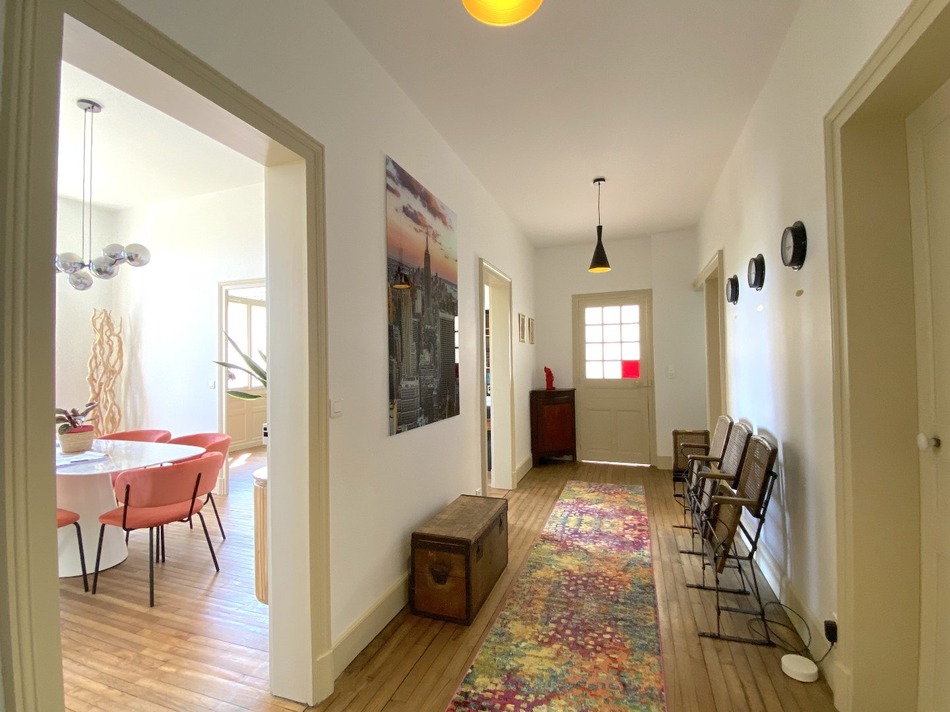 Town centre, services and schools on foot, a character house with swimming pool completely renovated with care on more than 206 m² of living space on a beautiful landscaped plot of 1,085 m2. It is a recent total rehabilitation: electricity, plumbing, sanitation, gas central heating, double PVC frames, insulation of walls and ceilings with blown rock wool, central vacuum, electric gates, mains drainage, built-in swimming pool. A finish that is the result of a perfect marriage of refined taste with the original elements: high ceilings,wooden floors throughout, an original glass vestibule, bright rooms thanks to the large windows. A very welcoming and a esthetically very successful house. A very spacious living space on three floors: a fully equipped kitchen which opens directly onto the wooden terrace and the swimming pool, a living room with fireplace, a dining room, an office, a master suite with its adjoining bathroom/shower room, a toilet. A beautiful wooden staircase leads to the first floor with its 4 bedrooms (!), 2 shower rooms with toilet and a TV/games room. From the kitchen, a staircase leads to the basement, which houses a closed garage, a gym, a laundry room, a workshop and a cellar. On the parking lot in front of the house, with its electric door, there are also the 2nd and 3rd closed garages. A very beautiful family town house (with swimming pool and a pretty garden), very spacious, in impeccable condition, full of charm, all you have to do is put down your suitcases!