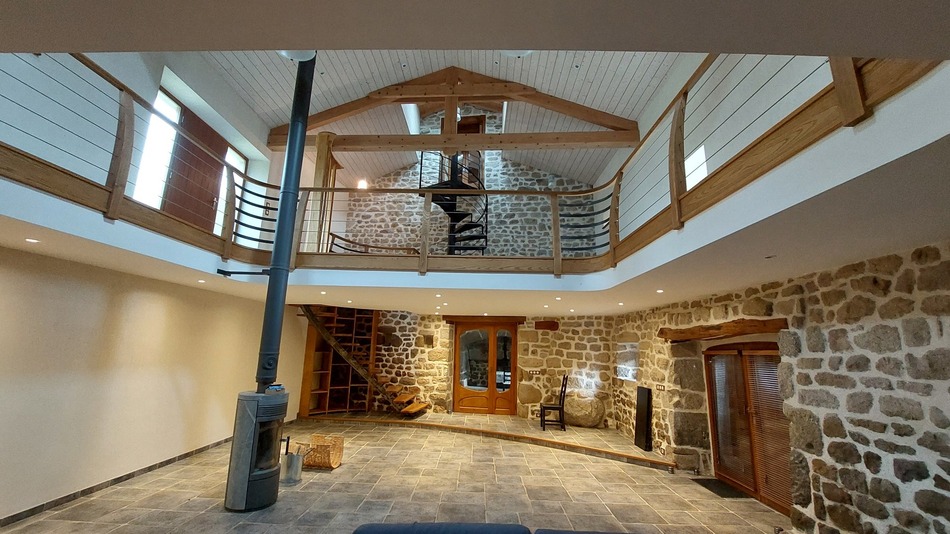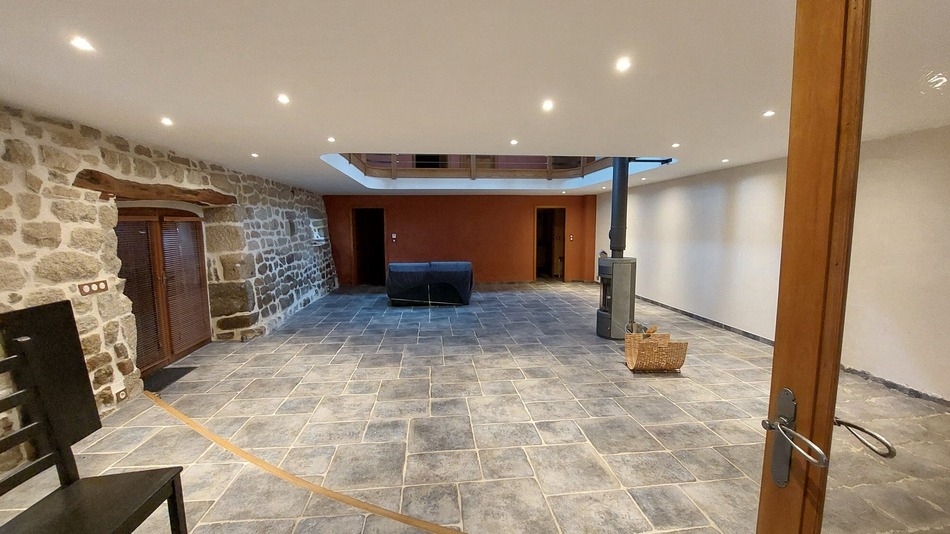 Country house, old farmhouse entirely renovated with taste and with beautiful materials offering very beautiful volumes. A pretty wooded park adorns this property. In the heart of the margeride, only 20 minutes from the A75 and 5 minutes from Malzieu, a medieval village, this house will delight lovers of nature and calm. No work to be planned: double glazing, geothermal heating as well as a wood stove in the living room, very good insulation, recent roof, cinema room !! All openings are 80cm to facilitate access for people with reduced mobility. Fully equipped kitchen with its pellet stove, opens onto a large living room of 68m2 very bright. A large master suite as well as a shower room, wc, are also on the ground floor. The technical part of the geothermal energy also. Upstairs there are two bedrooms, a separate toilet and a cement room with a giant screen. A very pretty contemporary staircase leads to an office with a fireplace and a bedroom. Above, an attic that can be used as a bedroom or playroom. An outbuilding with electricity and electric heating will delight the children who will make it their cabin. A garage. Ideal for a family home or used as a gite. To visit without delay!