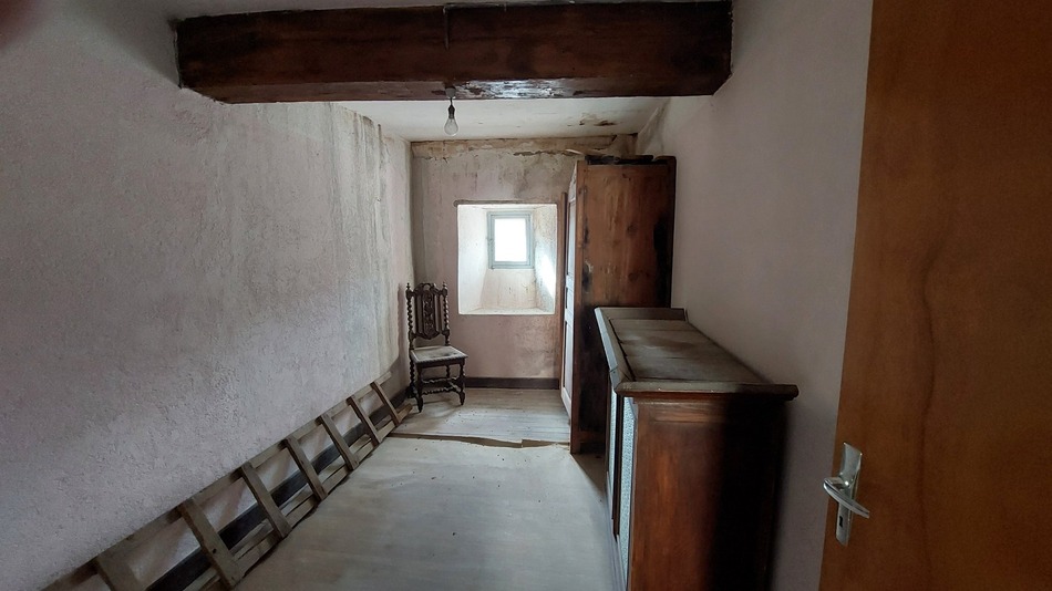 Village house without land, close to shops, in a charming little village. The interior needs to be refurbished: shower room, electricity, plumbing, kitchen, windows. The roof has been redone. The floors are parquet. You enter a corridor which leads to two rooms which could be converted into a bedroom or living room. At the end of the corridor is the kitchen area with an old fireplace and cupboards, which offers a beautiful view of the statue of the Virgin. A bathroom equipped with a sink and a toilet is completely level. Upstairs, three rooms including a large room which serves as a living room. A space with a water point, a toilet. An attic with a good height under the roof could be converted. A cellar in the basement.
