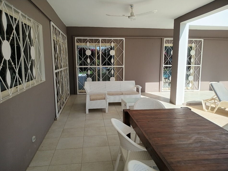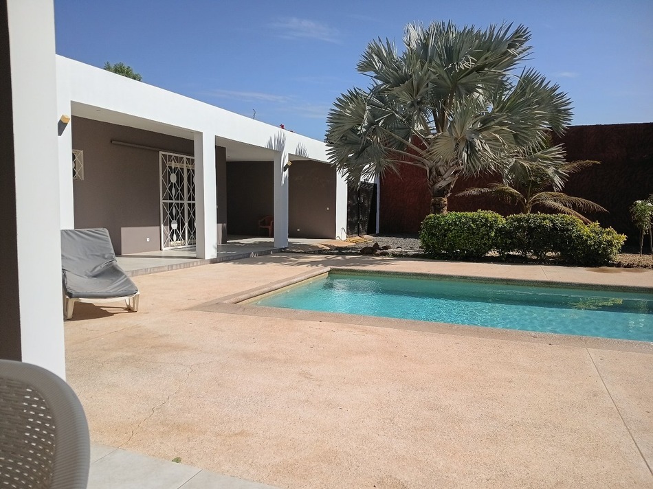 Tout proche du rond point de Ngaparou et du centre ville , à 100 m de la route de DAKAR et face l'école bilingue EBA villa de 205 m2 habitables comprenant une très grande pièce a vivre, avec salon ,séjour , salle à manger . 4 chambres dont 1 indépendante avec chacune sa salle d'eau , une cuisine équipée avec ilot central , une 2ème cuisine indépendante , une buanderie . La villa est entièrement meublée et décorée A l'extérieur sur un grand terrain arboré de 1226 m2 , une grannde terrasse aménagée , une piscine à énergie solaire , un grand garage fermé . Batteries / onduleur en cas de coupure , panneaux solaires , .forage réseve d'eau , jardin arboré ,