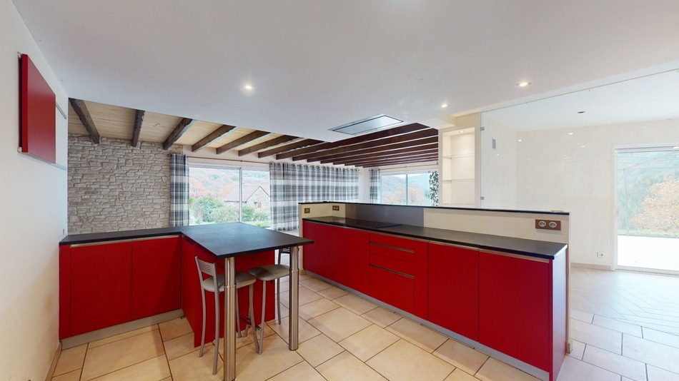 Are you looking for a primary or secondary residence, quiet and surrounded by beautiful green spaces? Do you dream of living close to nature in a region rich in sporting and recreational activities (fishing, hiking, mountain biking, etc.)? You will fall in love with this atypical country house, covered with larch wood cladding and stone facings, spacious and bright, and nestled in a small green setting of around 1ha. It benefits from a south-facing orientation and a strategic overhanging position, offering a clear and privileged view of the Tarn Valley. This living space, on one level, combining modernity and zenitude, was built in 2012 with healthy and noble materials. It consists of an entrance hall, a semi-open kitchen, a large living room of +60m² equipped with a closed fireplace (insert type) and bay windows offering a direct view of the garden and the Raspes du Tarn. Two beautiful bedrooms (one of 19 m² and one of 13m²), an office with large bay windows as well as a bathroom with separate WC and a laundry room, complete this pleasant and comfortable habitat. In the basement, a large garage of +50 m² as well as a cellar of +80 m2 on a concrete slab, house the technical room (PAC, thermodynamic water heater). An ideal indoor space for storing equipment, vehicles, bikes or motorbikes etc A beautiful south-facing terrace, with ground lighting and iron pergola, to enjoy the outdoor spaces all year round. The land adjoining the house is flat. The other surrounding plots are slightly sloped. one of them has a shed ideal for a grazing animal such as a goat, sheep, donkey, etc. The property is located in a small, peaceful cul-de-sac of only 4 houses. The roof is in Roman tiles, it dates from 2012 and is in good condition. The insulation was made of blown glass wool in the attic, 20 cm of crossed rock wool fiber on the exteriors and 10 cm of Styrodur on the floor. Heating and air conditioning are provided by a reversible air/air heat pump The wood insert has heat distributors. Aluminum double glazing and electric roller shutters on all windows (except curtains for the bay windows in the living room) DPE B - GES A The individual sanitation (septic tank) recently checked is compliant. Information on the risks to which this property is exposed is available on the Géorisks website: www.georisks.gouv.fr »