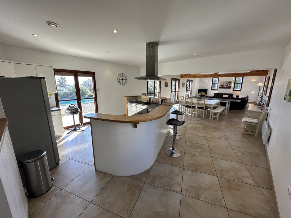 This quality property is set in a landscaped garden with pool and tennis court. Situated in the beautiful village of Montouliers, it has lovely views over the vineyards. The property was built to make the most of the views, pool and garden. On the ground floor, there is a vast, open-plan living area, with access onto the pool terrace through the four pairs of double doors. Also on the ground floor, there are 3 bedrooms, each with double doors leading onto the garden. Upstairs, there are 3 further bedrooms, each with beautiful views over the garden. There are plenty of bathrooms to accommodate everyone, including two en-suite bathrooms. A second salon and a fully-equipped laundry room complete this high-specification house. Outside, the garden comprises of a pool, terraces and tennis court, planted areas, a large lawn with olive trees, and an ample parking area with shade-giving trees. This property was designed with the enjoyment of Southern living in mind, and it absolutely delivers on this remit. With its big volumes and the easy liaison between indoors and outdoors, it offers the best in Southern French lifestyle.