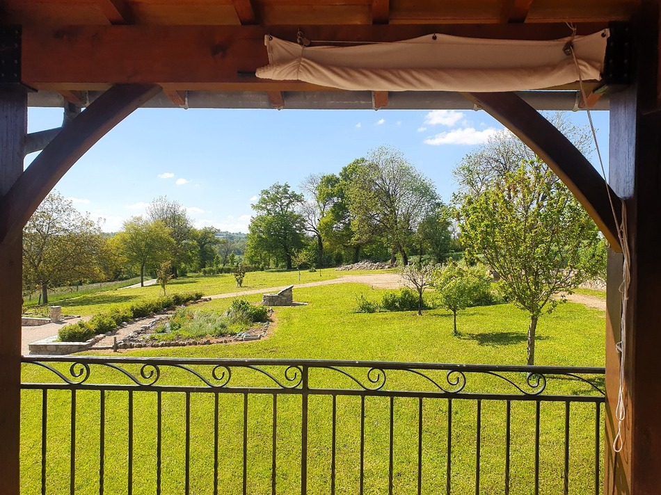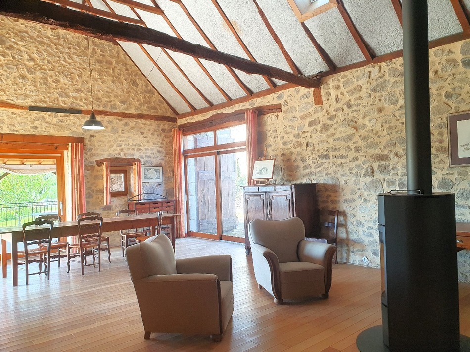 This stone property has recently been renovated. Situated in a peaceful setting on the edge of a small hamlet, it benefits from pleasant, unobstructed views over the grounds of more than 4,000 m². The house is entered via an entrance room with a well. The kitchen, recently renovated (2022), has a wood-burning stove and access to the outside. From the kitchen, half a floor up, there is a study. Then there is a bedroom with en suite shower room and toilet. From the entrance hall, a few steps lead up to a spacious living room (67 m²) with a central wood-burning stove, underfloor heating and a large custom-made walnut bookcase. Extending westwards from this living room is a large covered terrace equipped with a summer kitchen and barbecue, with commanding views over the garden and surrounding countryside. Opposite the terrace is a bedroom with en suite shower room and toilet. This room is topped by a mezzanine, useful for storage. From the entrance hall, a corridor leads to the first room, which is used as a storeroom (but could be converted), a shower room, a toilet, a further room and a bedroom. These last two rooms have access to the garden and could be used as a gîte. A separate gîte already exists: a secadou has been converted into an independent flat. A 35 m² garage is located under the terrace. A 19 m² cellar provides additional storage space. In front of the house, which has a good southern exposure, there is a terrace with a trellis. Insulation work, double glazing and a heat pump all contribute to the good DPE rating (D). The property benefits from two wells plus a 10 m3 cistern, as well as an underground watering system. The septic tank is compliant. The house is connected to the fibre optic network. No major works are required. The roofs have been redone and insulated. Combining old-world charm with modern comforts and featuring numerous shower rooms and WCs, this spacious, well-maintained property has a lot to offer. Villefranche is 15 km away.