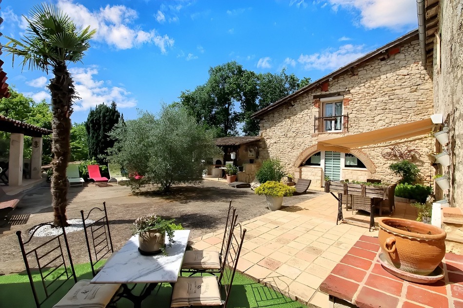 Magnificent old stone farmhouse, fully restored, early 20th century. A wooded plot of 6,500m², not overlooked and quiet. At the end of a wooded path, the all-stone building opens its doors to us... It is impressive with its stone facades, its flowery charm, its wooden shutters and its open angle onto the interior courtyard. The main house of 200m² is articulated on the ground floor, towards an open kitchen of 25M² fully equipped and integrated into the old curved fireplace in soapstone finely carved by hand, strongly inspired by Louis XV style fireplaces. The vast, bright living room of 45M² offers privileged access to the terrace and patio, an office of 32M² with separate WC, a storeroom and a laundry room, upstairs via a solid wood staircase, we find 2 bedrooms of 25 and 12 M², a bathroom of 9M² with corner bath and shower, further on, a dressing room that can open to the other part of the building. From the interior courtyard we pass to the rear of the property and thus gives access to another dwelling of 90M² including 2 master suites with shower, a living room open to the fully equipped rustic kitchen. In the right wing of this real estate complex, a former stable completely restored into a 150M² dwelling, comprising on the ground floor a 65M² living room, a shower room and access to the patio, upstairs 3 bedrooms, a dressing room that can open to the other part of the main house... This former farmhouse, which has become a beautiful real estate complex, is composed of 3 dwellings that can be quickly combined or offered as a gite and thus offer very good rental profitability. A 23M² garage, a 33M² workshop, a 20M² wine cellar, a 23M² green pool house, a 9M² summer kitchen and a 170M² patio complete this exceptional property. A low land price and close to the village of Cahuzac-sur-Vere offering all amenities Shops, a school, a post office, a butcher's shop, a bakery, and a friendly terrace in the heart of the village. I am entirely at your disposal to come and discover your next property...