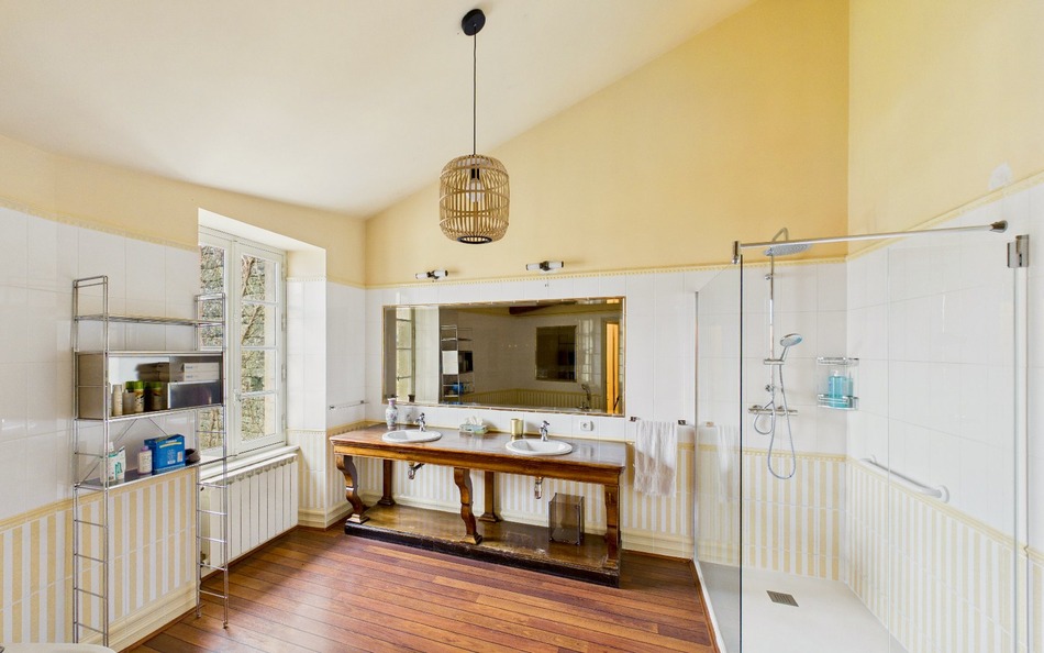 This magnificent former Logis has been sympathetically restored to an exceptional standard, seamlessly blending authentic French character with refined modern comfort. Offering approximately 335m² of elegant living space and achieving an impressive energy efficiency rating (C), the property showcases the very best of heritage preservation combined with contemporary performance. The renovation has been undertaken with great sensitivity and attention to detail, preserving beautiful original features such as flagstone floors, exposed beams, period fireplaces and fine wooden flooring. At the same time, substantial upgrades have been introduced, including geothermal central heating, double glazing, high-quality insulation and fully updated electrics, ensuring comfort and efficiency throughout the seasons. On the ground floor, two magnificent, light-filled reception rooms provide superb spaces for entertaining or relaxed family living. The luxury fitted kitchen with dining area is both stylish and practical, complemented by a boiler/laundry room, shower room and separate WC. A particularly rare and desirable feature is the stunning indoor heated swimming pool, allowing year-round enjoyment in complete privacy. A wine cellar completes the ground floor accommodation. Upstairs, five generous double bedrooms enjoy lovely views over the gardens, including a principal bedroom with ensuite bathroom. A dressing room, a spacious family bathroom with separate shower, and an additional WC provide excellent functionality for family life or hosting guests. An attached garage with electric roller door offers secure parking for two vehicles. The mature principal gardens are entirely enclosed by attractive stone walls, creating a peaceful and private setting. Laid mainly to lawn and enhanced by established specimen trees, they provide a quintessentially French country backdrop. Across a quiet village lane lies a second enclosed garden bordered by stone walling on one side and a charming stream on the other. Here you will find the tennis court and a productive vegetable garden. Adjacent to the court, an outbuilding with paved terrace has been partially converted and presents excellent potential to create a delightful guardian's cottage or guest annex, with space for an open-plan studio and shower room. This is a substantial and beautifully executed country residence offering impressive reception space, exemplary energy efficiency, geothermal heating, an indoor heated pool and an outdoor tennis court all within tranquil, mature walled grounds. A rare opportunity to acquire an authentic French Logis of character, thoughtfully modernised for luxurious 21st-century living.