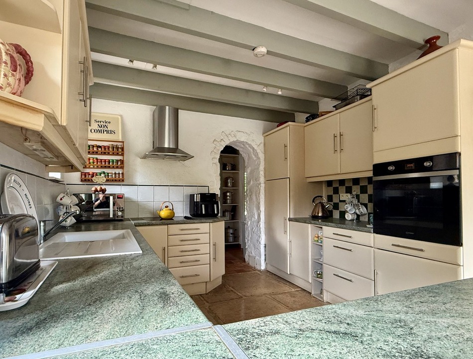 This enchanting stone longère combines timeless French character with modern comfort and is set in nearly 6,000m² of landscaped, south-facing gardens . Tucked away in a peaceful hamlet, it offers privacy while being just minutes from a bustling town with shops, restaurants, and full amenities. Step inside to elegant interiors full of charm: exposed beams, original tiled and flagstone floors, and generous living spaces. The heart of the home is the stunning 52m² living/dining room, where a magnificent stone fireplace and wood-burning stove create a cosy focal point. The fully equipped kitchen with utility opens onto a dining area and sunny terraceperfect for indoor-outdoor living. A second reception room adds flexibility, easily serving as a snug, home office, or ground floor bedroom. A shower room and WC complete the ground floor. Upstairs, the spacious landingcurrently a libraryleads to the master suite with dressing room, ensuite, and separate WC. Two further bedrooms (one double, one single) provide inviting accommodation for family or guests. Newly installed double glazing throughout ensures comfort and efficiency. Outside, the sunny terrace is ideal for al fresco dining, morning coffee, or soaking up the peace of the gardens. A substantial stone outbuilding adds huge potential, with a summer room, covered terrace, and open-fronted space with traditional barbecueripe for conversion into guest accommodation or a gîte (subject to permissions). There is also a useful attached barn and carport A rare chance to own a beautifully maintained, character-filled home in a tranquil setting with easy access to modern life.