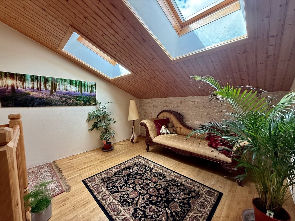 This stunning stone village property was originally renovated to an exceptional standard by skilled local artisans using the finest materials, blending traditional craftsmanship with modern comfort. The current owners have further enhanced it with thoughtful upgrades, including an energy-efficient heat pump, solar panels, and a beautifully appointed, fully fitted kitchen. Privately set in an elevated position, the property is surrounded by attractive gardens and spacious terraces at the front and rearideal for outdoor dining and relaxation. There is also ample space for a swimming pool, subject to planning. The generous layout begins with a welcoming entrance porch leading through glazed doors into a stunning full-height reception hall with a galleried landing and striking oak staircase. Off the hall is a cloakroom and access to a workshop and wood store. A partially glazed door opens into a stunning 42m² dual-aspect living and dining room with a log burner, which leads to the heart of the home: a 47m² fully fitted kitchen, ideal for entertaining. Beyond the kitchen are a laundry room with shower cubicle, a separate utility room, and a large integral garage offering excellent storage. Upstairs, the galleried landing leads to two spacious en-suite bedroomsone with a walk-in shower, the other with a bath and separate shower. A second staircase off the kitchen leads to a further landing serving two more bedrooms. A sweeping in-and-out driveway meanders through mature grounds to a gravel courtyard and south-facing terrace at the front. An oak-framed carport offers covered parking with space for several additional vehicles. Beautifully finished and energy-efficient, this is a home of rare qualityready to be enjoyed immediately.