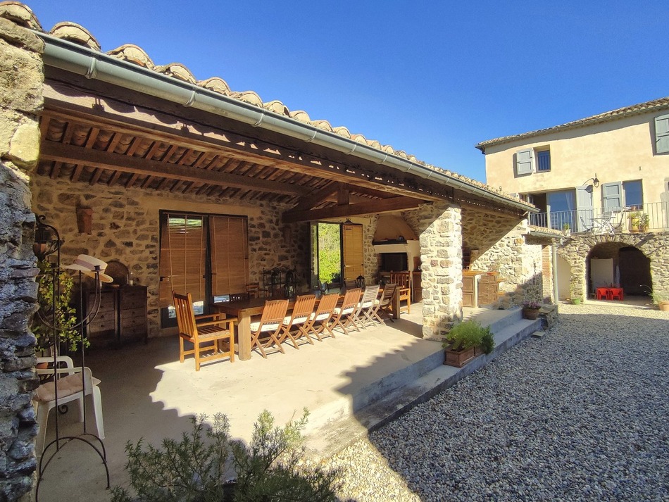 This 300 m² stone farmhouse, completely restored in 2004 and perfectly maintained since, combines charm, comfort and generous proportions. Ideal for family gatherings or entertaining guests, the main accommodation is spread over the first and second floors and comprises a 25 m² lounge, a 20 m² dining room, six large bedrooms and a 45 m² room with a fireplace on the ground floor. The gardens extend to approximately 1 hectare (2 ½ acres) of flat land and 5.5 hectares of woods and forest. The layout is both welcoming and offers additional potential: built around an enclosed gravel courtyard with a terrace, a 41m² covered summer kitchen and a 70m² barn offering great potential for conversion. Outside, an 11 x 6 m saltwater swimming pool with automatic temperature control invites you to relax. The garden and adjoining land benefit from a watering system fed by one borehole and a well. Located in a quiet environment between the north of the Gard and the south of the Ardèche, the property enjoys a privileged location close to the medieval villages of Saint-Ambroix (4.5 km), Barjac (18.5 km) and Les Vans (21.5 km). The region is rich in major tourist attractions such as the châteaux of the Cèze, the Ardèche and Chassezac gorges, the Chauvet Cave, as well as our historic villages and Provençal markets. Access and transport TGV station: Nîmes (72 km) or Avignon (85 km) Airports: Nîmes (70 km), Montpellier (115 km), Marseille (160 km) Motorways A7 (Montelimar 92 km) and A9 (Nîmes 72 km)