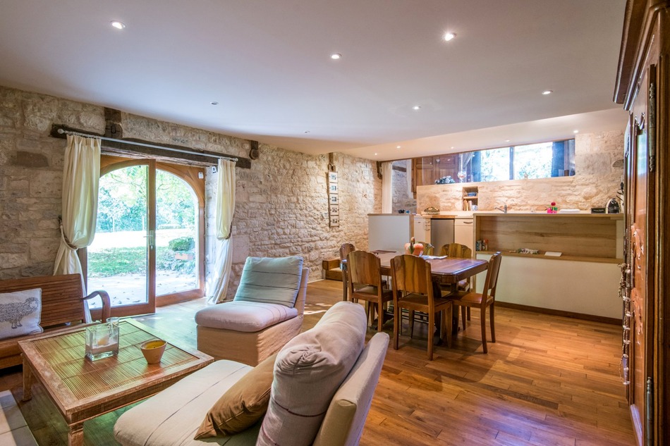 This charming and exceptional property is located on a large plot of over 1500 m2, nestled in a bucolic environment and without any nuisance. The garden is bordered by a lovely stream, offering a soothing soundscape and a unique atmosphere. The house is a former barn, carefully restored in 2000, favoring beautiful traditional materials (exposed stone and beams) for an unrivaled charm and assured durability. The main house combines the character of the old with modern comfort: The heart of the house is its very bright living room of 37m2, equipped with an enormous bay window that floods the space with natural light and offers an unobstructed view of the garden. Its atypical shape and generous volumes make it a convivial and unique living space. The ground floor offers an 11m2 bedroom with its private bathroom, guaranteeing comfort and privacy. The upper floor is designed for adaptability. A bedroom of 11m2 and a second of 28m2 offering the possibility of easily dividing it in two, as well as a second bathroom. A 13m2 relaxation area, office or reading area has been fitted out, superbly highlighting the authentic charm of the stone to work or recharge in peace facing this immense bay window in the shape of the barns of yesteryear. Enjoy a large sheltered terrace, ideal for extending meals outdoors all year round, lulled by the sound of the water, and a healthy cellar, valuable for storage. A major asset for this property: a pretty stone outbuilding of 32 m2 to renovate. This completely independent space offers a rare opportunity to create a gîte or a guest room for additional income. Set up an artist's studio or an independent office for teleworking. This property is a real favorite, combining charm, modern comfort, and rare development potential. Contact us without delay to receive more information and organize your private viewing. Information on the risks to which this property is exposed is available on the Georisques website: www.georisques.gouv.fr »
