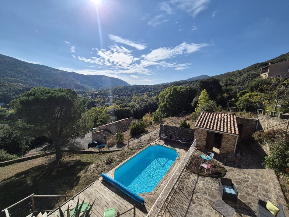 Enjoy peaceful living in the Jaur Valley, just 76 km from the sea and 58 km from Béziers. Close to the beautiful village of Olargues, this home offers stunning mountain, forest, and river scenery. Set on its own private grounds of approximately [x m²] in an elevated position, this modern home offers tranquil living with spectacular 360° views across the heart of the Parc naturel de Haute Languedoc. Spread over two levels, it features a spacious main living area with three bedroomsone ensuitealong with an unusual living room and a fully equipped, contemporary kitchen with a generous pantry. The main terrace provides an incredible space to enjoy the breathtaking scenery, complete with a barbecue area ideal for outdoor dining and entertaining. A secondary terrace behind the kitchen offers a perfect spot for morning coffee and access to a stone garden, ideal as a vegetable plot close to the kitchen. The ground floor includes a one-bedroom apartment with direct pool access and nearly 100 m² of utility space, including a large garage, workshop, and cellarseasily convertible into additional living space to accommodate a larger family or project. This property also features excellent rental potential as a holiday let, given the area's popularity for walking, hiking, fishing, and hunting all year round. Located just 76 km from the sea, 58 km from Béziers, and minutes from the charming village of Olargues, with its bakery, grocer, and restaurants, as well as Saint Pons (8 km). Experience peaceful, versatile living in a truly scenic setting with stunning natural beauty and all amenities close by.